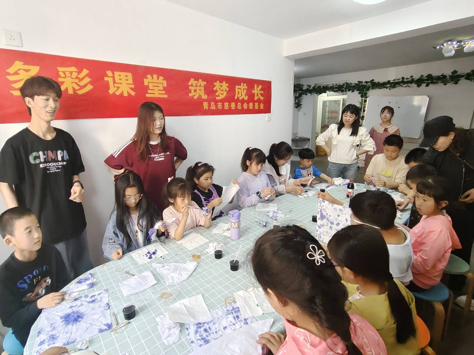 为进一步贯彻习近平新时代中国特色社会主义思想和党的二十大精神,传承优秀传统文化,扎实推进“百万大学生进社区”活动,6月2日,海洋学院“山海情支教调研团”赴李沧区翠湖社区开展“投身志愿服务,绽放扎染色彩”手工扎染支教活动。