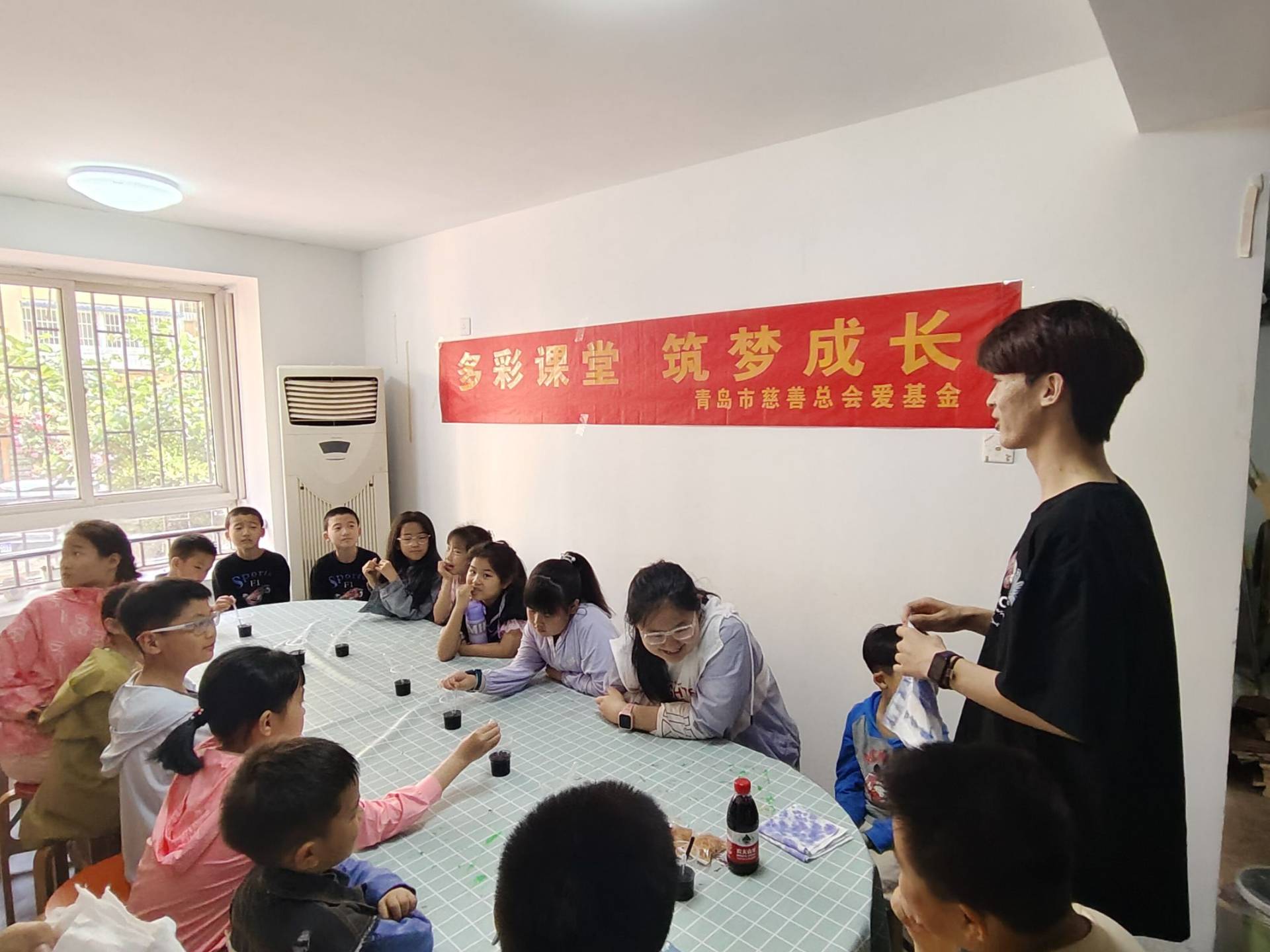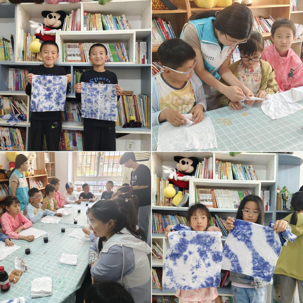 活动开始,志愿者们为社区小朋友介绍了有关扎染的历史,讲解了扎染的基本内容,也实操展示让大家掌握扎染图案扎结和植物染色的方法技巧。社区小朋友在志愿者们的指导下,将布料运用三角形扎结法和旋转扎结法进行折叠、缠绕、卷曲,随后在染液的浸润下染色,创作出形态各异、色彩斑斓的扎染作品。活动过程中,大家互相交流、讨论,现场氛围十分活跃且融洽。