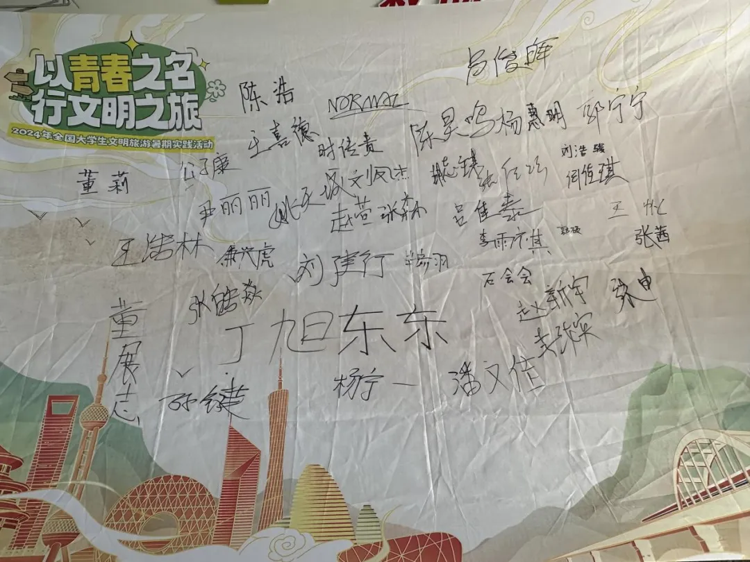 与此同时,志愿者还在商城一处架设了签名墙和直播设备,用线下线上相结合的方式进行宣传,吸引了不少商城顾客,志愿者们面对镜头对在场顾客再次宣传了文明旅游公约,讲解之余,志愿者们邀请现场顾客在签名墙上留下自己的姓名,成为践行文明旅游与绿色出行的一份子。