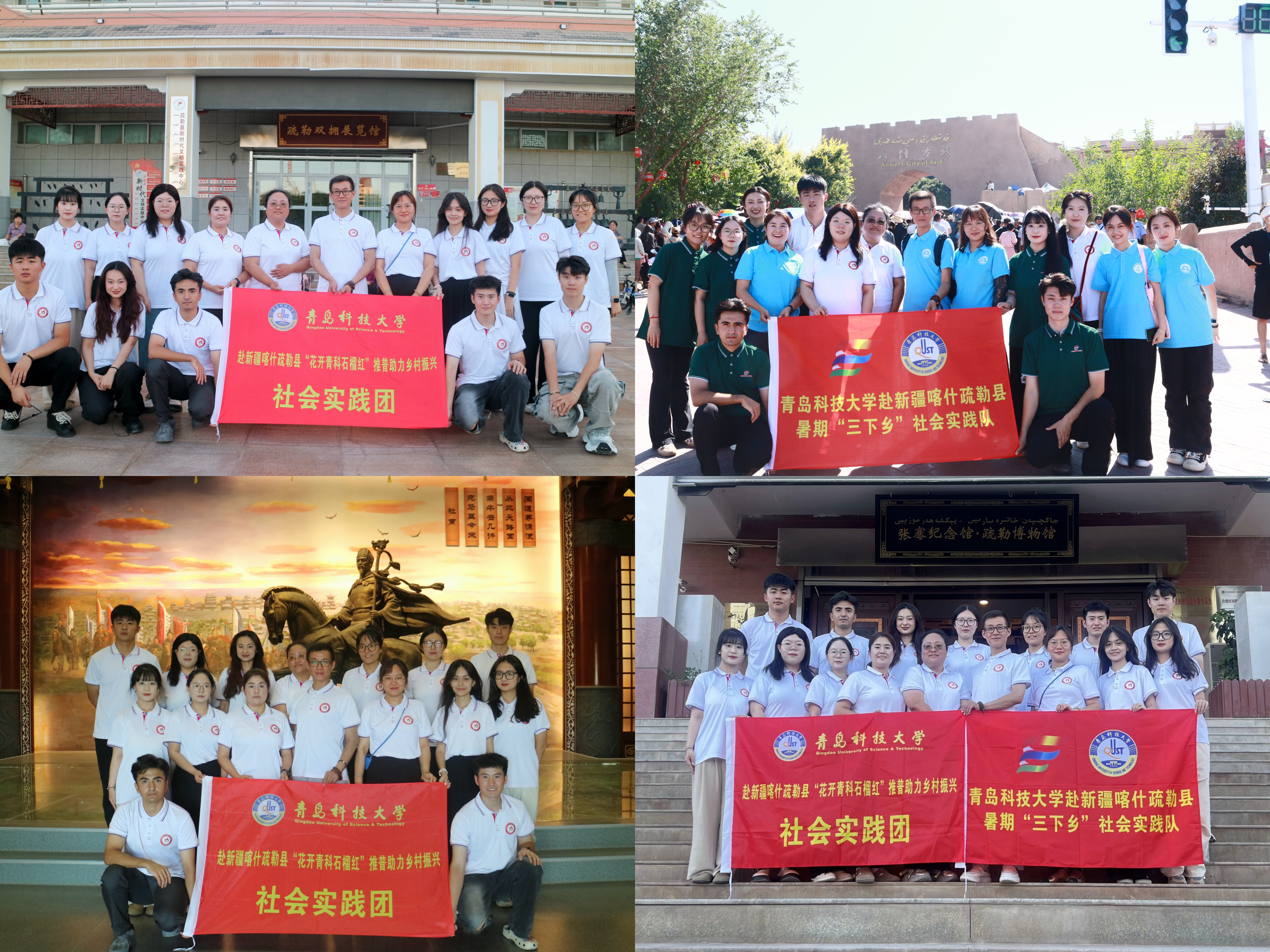融合本地红色资源,推动文化传播。为深入学习贯彻习近平新时代中国特色社会主义思想,“花开青科石榴红”团队,在实践地充分挖掘当地红色资源和民族文化,分别在张骞纪念馆·疏勒博物馆、疏勒县双拥展览馆和喀什古城开展社会实践活动。疏勒双拥展览馆以拥政爱民、军政军民共建方面工作的图片、文字以及实物陈列等形式,展现了从解放军、工作队驻勒到改革开放新时期疏勒双拥工作探索、形成、壮大、发展的历史征程和基本经验,深刻诠释了疏勒县军民共建、鱼水难离的双拥工作格局。