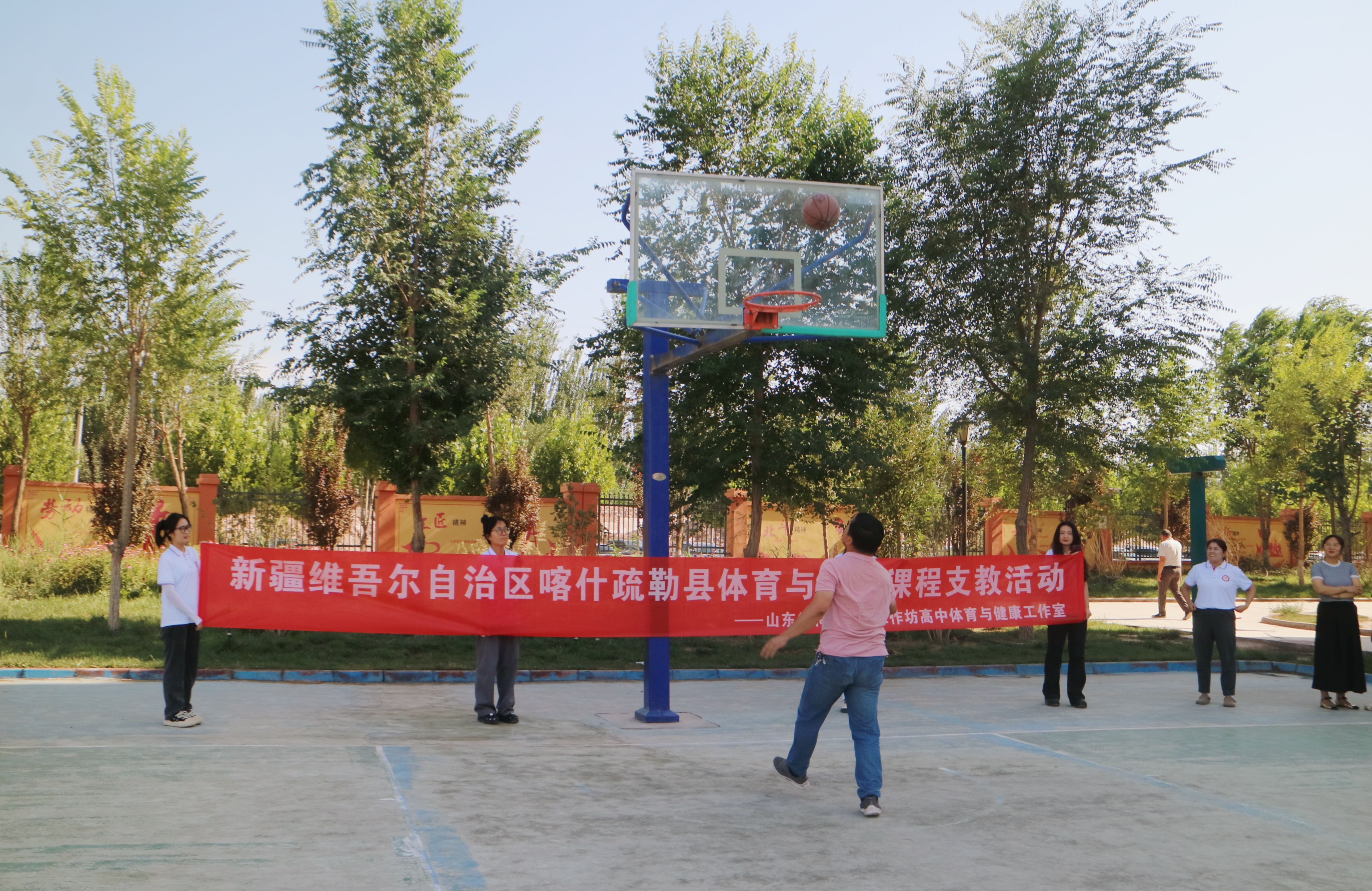 郭帅辰、仇东程、李俞霖和迪力夏提·阿吾提在新疆喀什疏勒支教期间,积极参加多民族友谊篮球赛,以篮球为媒,搭建起民族交流的桥梁。场上,他们奋力拼搏,展现体育精神;场下,他们促进交流,深化民族团结。这一行动,完美诠释了“爱体育,兴科大”理念,为推普助力乡村振兴事业贡献了自己的力量。