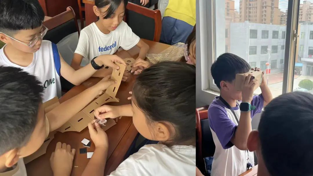 为响应国家科技创新政策,让孩子们在实践中感受科技的魔力,志愿者们带领孩子们动手制作简易VR眼镜并介绍VR眼镜的工作原理,包括透镜如何改变光线,以及虚拟现实技术的基本理念。孩子们在志愿者的指导下,动手制作自己的VR眼镜,体验从零到一的创造过程。通过讲解与指导孩子们动手操作,孩子们不仅学习了基础光学原理,更激发了对虚拟现实技术的好奇与兴趣。这不仅是一次动手能力的锻炼,更是一次创新思维的培养,为孩子们的科技梦想插上翅膀。