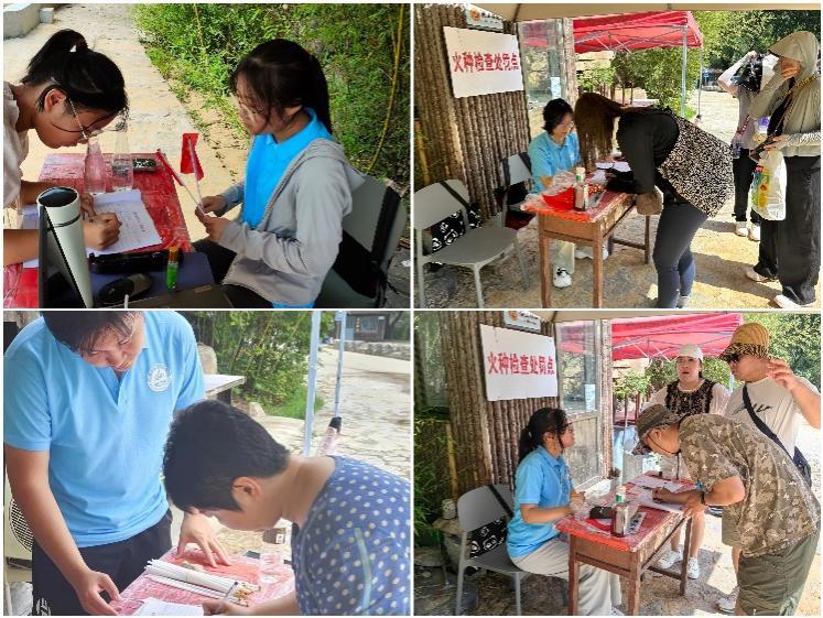 在森林防火志愿服务活动中,实践队通过景区管理方详细了解当前景区森林防火工作的要求。随后,实践团成员分成若干小组,分别负责景区服务、森林防火宣传、火源管控、隐患排查及应急演练等工作。实践团成员在主要游览线路上给游客们大力宣传景区特色并普及森林防火知识,协助景区工作人员检查游客是否携带火种,收缴易燃易爆危险物品,并积极运用网络直播等方式加大对景区森林防火知识的宣传,在景区可能存在的火灾隐患的多个重点区域进行全面排查。最后,实践团成员们和景区工作人员一起参与了景区的森林防火应急演练。