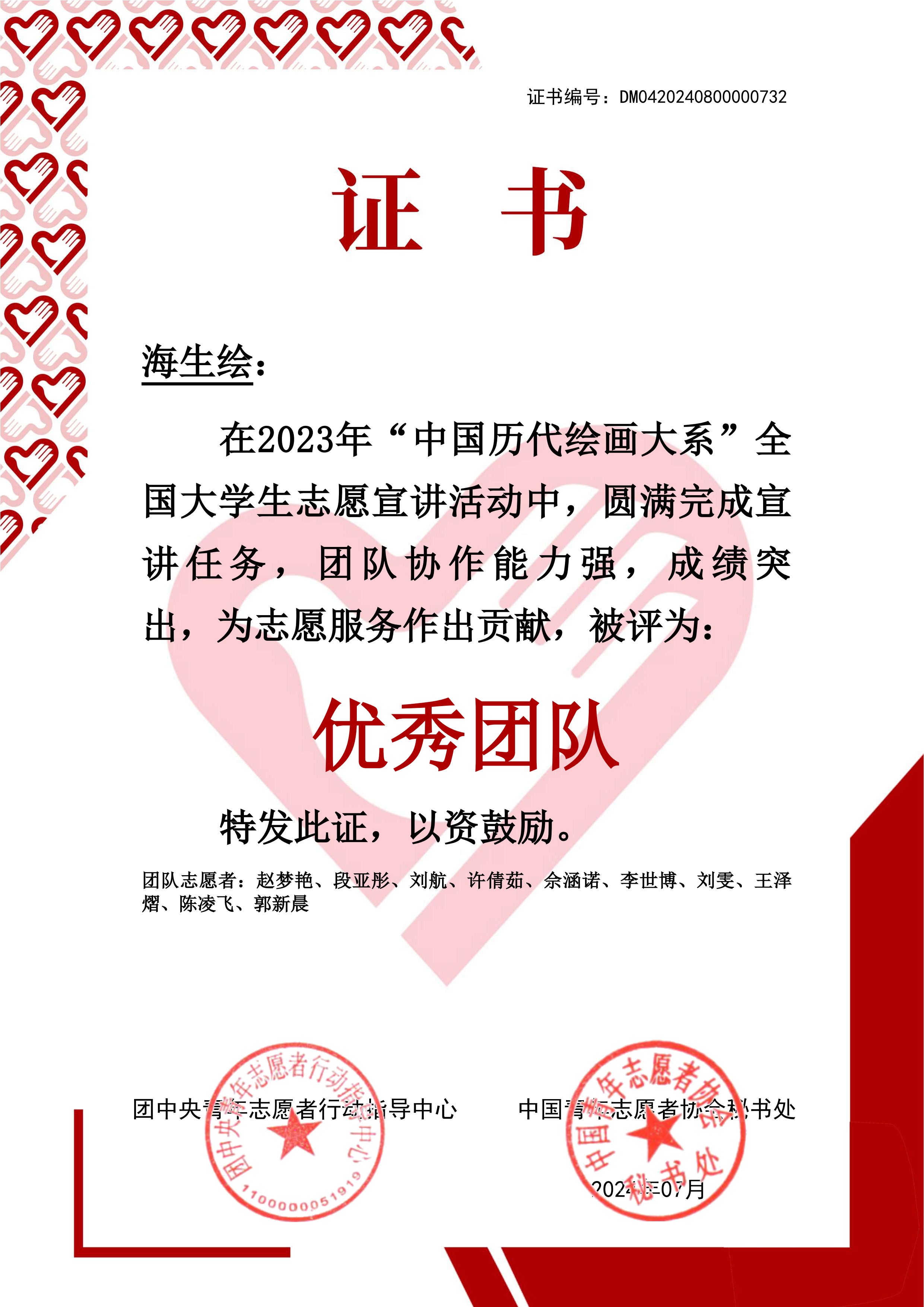 近日,团中央青年志愿者指导行动中心、中国青年志愿者协会公布了100支2023年“中国历代绘画大系”全国青年学生志愿宣讲活动优秀团队名单。生物工程学院团委由郭新晨、段亚彤、佘涵诺、赵梦艳、王泽熠、李世博、刘雯、刘航、许倩茹、陈凌飞等十名同学组成的“海生绘”志愿宣讲团从1000支宣讲团队中脱颖而出,荣获全国“优秀团队”荣誉称号。