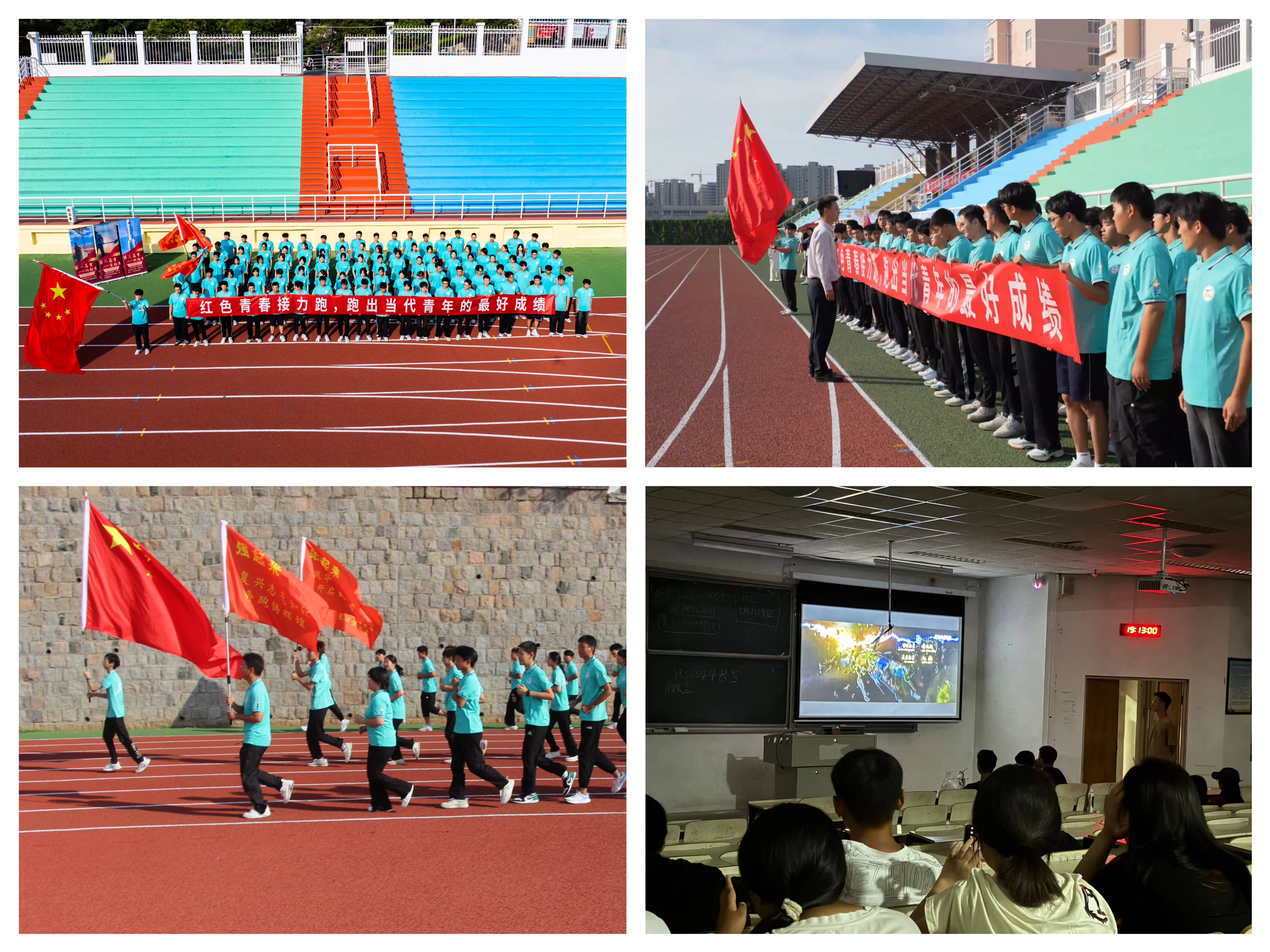百名学子面向朝阳,青春集结,以接力跑的形式共庆中华人民共和国成立75周年。党员先锋高举“站起来”“富起来”“强起来”三面旗帜,昂扬领跑,接力奔跑中,同学们重温红色之路,感悟奋进征程,努力以青春之姿,跑出科大风采,谱写时代华章。“光影铸魂”活动组织师生观看“建国三部曲”红色电影,收集观影感悟,带领同学们从影片中了解党史,牢记峥嵘岁月,坚定理想信念。