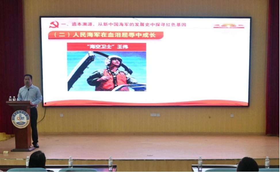 宣讲在海军五大兵种的纪录片中展开,曹怀玺同志先讲述了海军的发展历史,从讲述海军发展中的令人感动、令人惊叹的历史故事入手,深入浅出,在追根溯源中探寻红色基因,在海军从无到有、从有到强的艰难历程中展示中国人民坚韧不拔的奋斗历程。