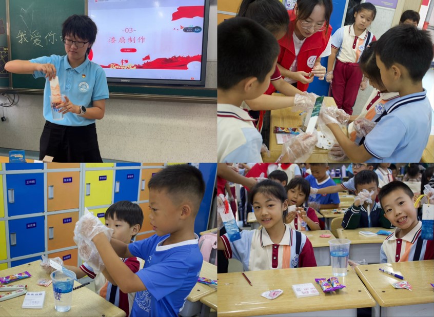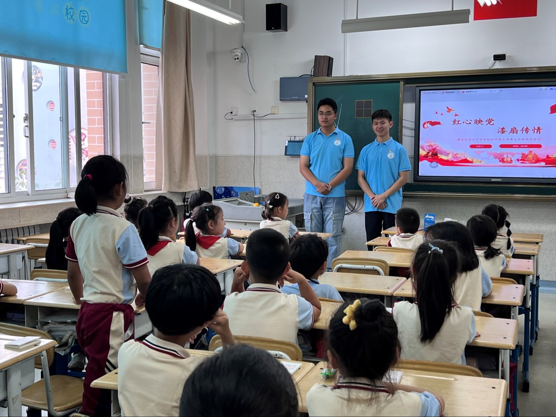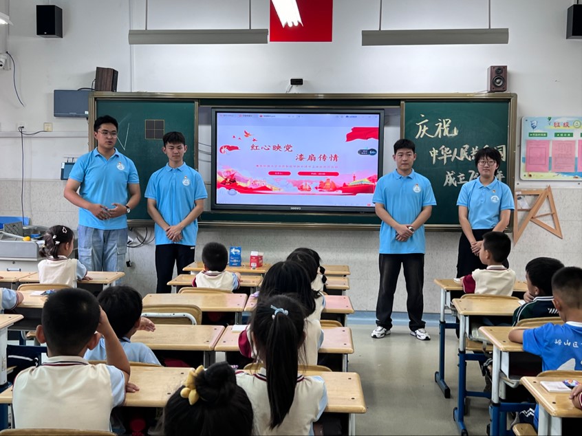 实践队中的党员代表邵帅、康今宝、李佳潼和王佳雯,与同学们进行了轻松互动,设置了如“新中国是什么时间成立的”“你的理想是什么”“你将会如何向好朋友们宣传非遗文化”等问题。同学们参与热情高涨,对祖国的重要生日了然于胸。有的同学则表示将来想要成为一名人民警察,有的表示会和好朋友一起多多参与非遗体验活动等等,将现场气氛推向了高潮。在场青年学生中绝大多数已加入了少先队,4名党员也结合个人经历,与同学们分享了自己的成长故事,希望他们从小坚定红色信仰,树立远大理想,学好知识本领,为强国建设贡献力量。