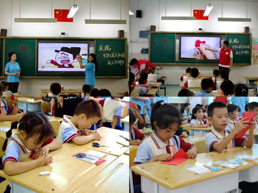 实践队成员王涵、牟贝洱为同学们讲解了胶州剪纸的历史起源和发展过程,现场演示了“囍”字的裁剪过程。一幅幅精美的剪纸作品,吸引了同学们的注意力,纷纷惊叹于剪纸技艺的神奇魔力。王茜、宋禹呈和姜琳峰则带领同学们亲自动手裁剪五角星,大家认真投入的样子,已然将沉甸甸的爱国情感注入其中,同学们将五角星捧在胸前,寓意时刻将祖国放在心中。