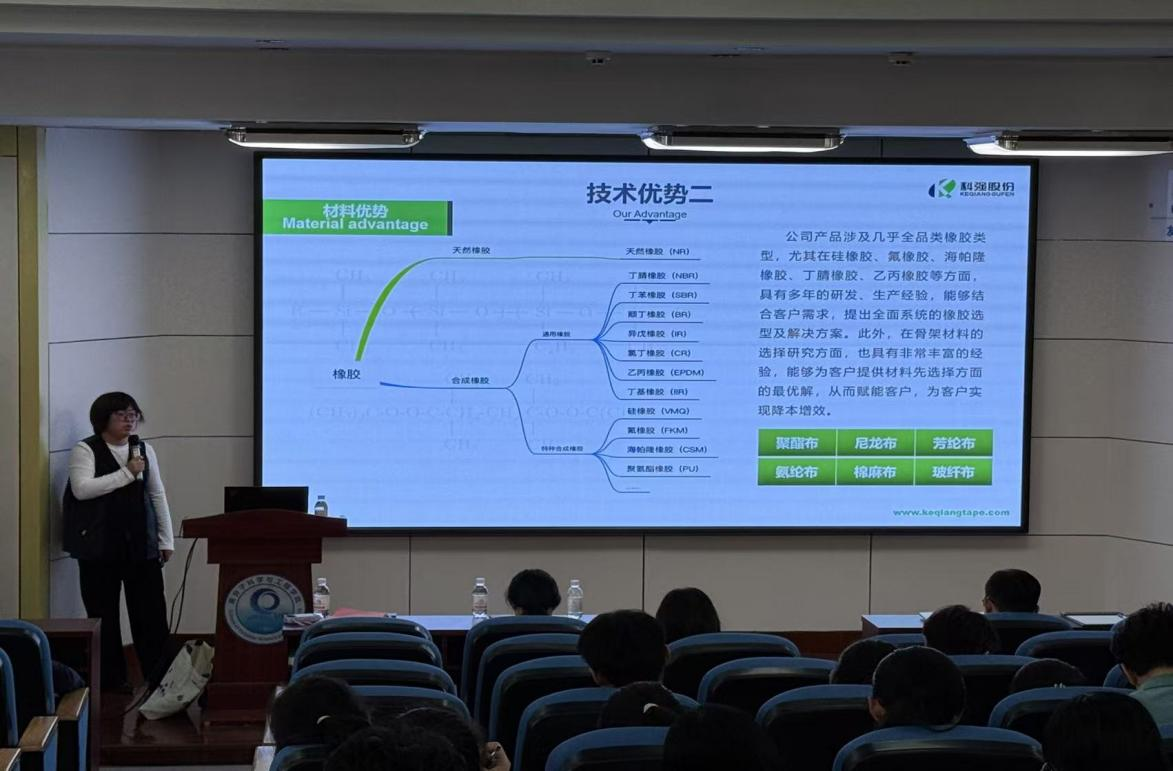 江苏科强新材料股份有限公司人事经理曹芳向同学们介绍了公司的基本情况以及装备技术优势。还向同学介绍工作福利,晋升渠道等信息,也为同学们拓宽职业选择方向,提供学习和发展的机会。