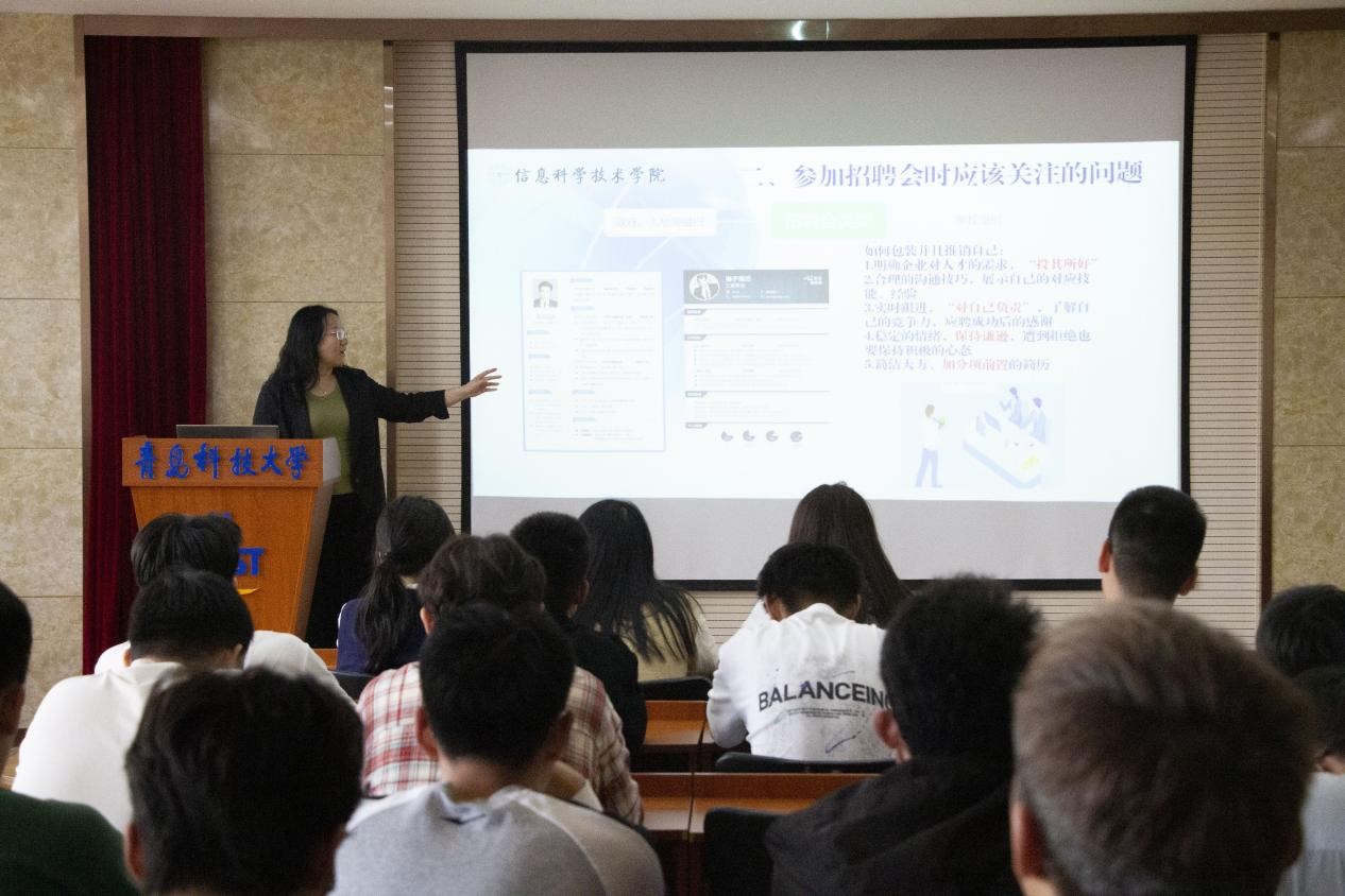 会议上,丛文翠老师就毕业去向、招聘会介绍、签约类型等方面进行详细的介绍。她指出当前就业市场竞争激烈,高校毕业生人数逐年增加,强调信息技术行业对求职者在技术能力、学习能力和团队协作能力方面的高要求。同时详细介绍毕业各种去向,用丰富的经验为青年学生们提供多项毕业指向。她提到了企业就业需根据专业、兴趣选择行业和岗位,通过校园招聘、社会招聘、人才中介等多种途径求职,要求青年学生们掌握面试技巧,在工作中学习和积累经验。
