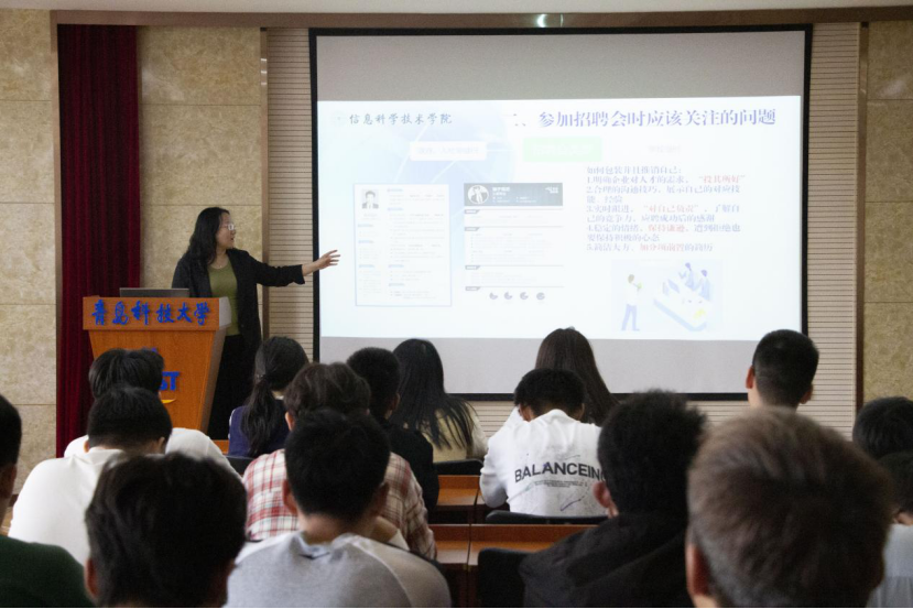 会议上,丛文翠老师就毕业去向、招聘会介绍、签约类型等方面进行详细的介绍。她指出当前就业市场竞争激烈,高校毕业生人数逐年增加,强调信息技术行业对求职者在技术能力、学习能力和团队协作能力方面的高要求。同时详细介绍毕业各种去向,用丰富的经验为同学们提供多项毕业指向。她提到了企业就业需根据专业、兴趣选择行业和岗位,通过校园招聘、社会招聘、人才中介等多种途径求职,要求同学们掌握面试技巧,在工作中学习和积累经验。
