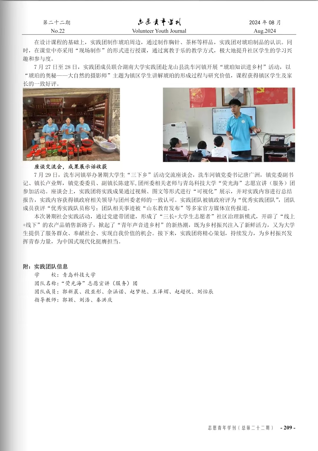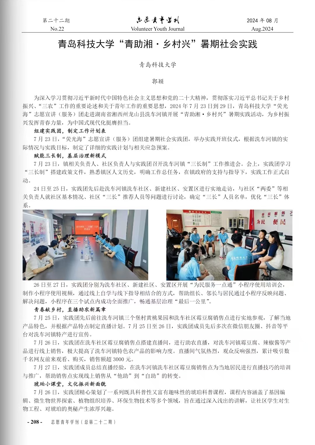 近期,由《志愿青年学刊》编辑部开展的2024年暑期“三下乡”社会实践专刊(上辑-活动纪实;2024年8月刊;总第二十二期)征稿审稿录用工作已完成。生物工程学院由刘浩、秦洪庆、郭颖老师指导的《MILE米乐集团“青助湘·乡村兴”暑期社会实践》一文通过编委会审核,已于《志愿青年学刊》2024年暑期“三下乡”社会实践专刊(上辑-活动纪实)发表。