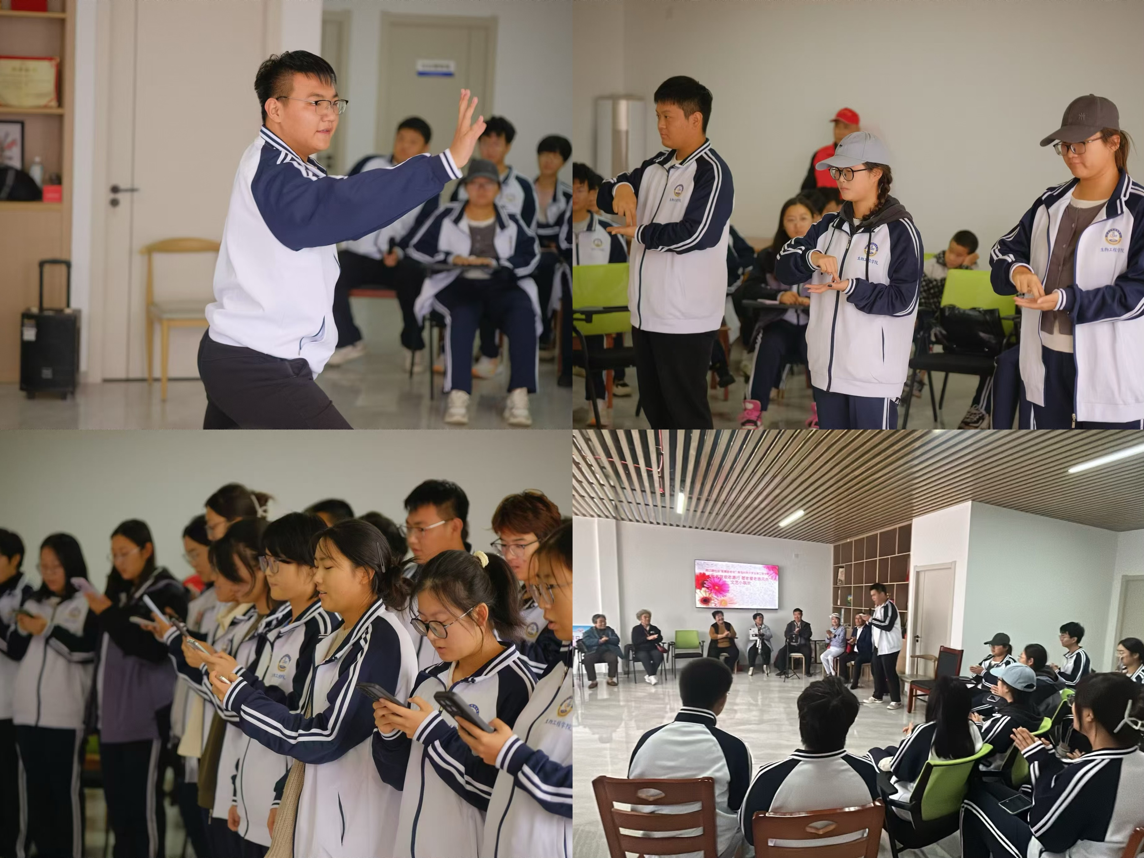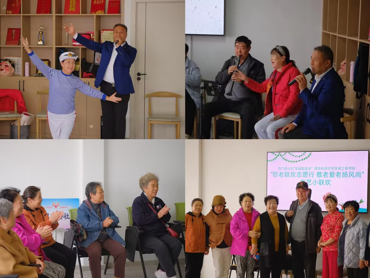 活动当天,周口路社区内洋溢着大家的欢腾与期待。生物工程学院青年学生身着统一的服装,如同秋日里的一抹亮色,为社区增添了的活力。他们与社区居民欢聚一堂,精心为社区居民准备了丰富多彩的才艺展示,包括歌曲、手势舞、武术和诗朗诵,精心编排的表演节目逐一呈现。社区居民也纷纷展示了自己的才艺,包括乐器演奏和歌舞表演,一首《红歌六联唱》,更是带动起全场老人和志愿者们的大合唱,美妙的旋律久久萦绕在大家心中。