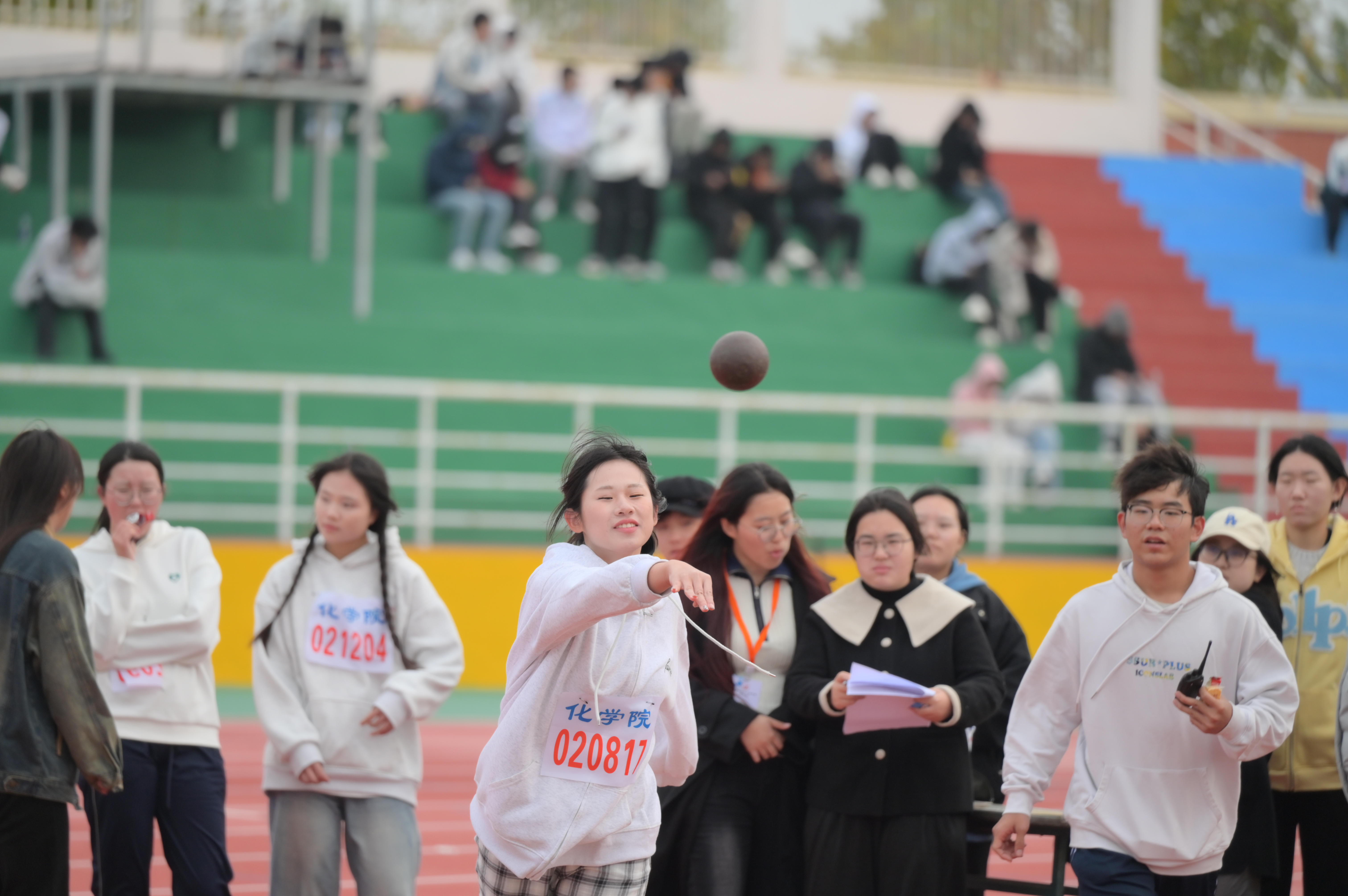 与此同时,田赛也在热烈开展。跳远选手似雄鹰展翅,在空中划过优美的弧线;铅球运动员也正以力量为笔,书写拼搏的画卷。他们用技巧与力量挑战自身极限,展现着田赛独特的魅力,诠释着更高更远的追求。
