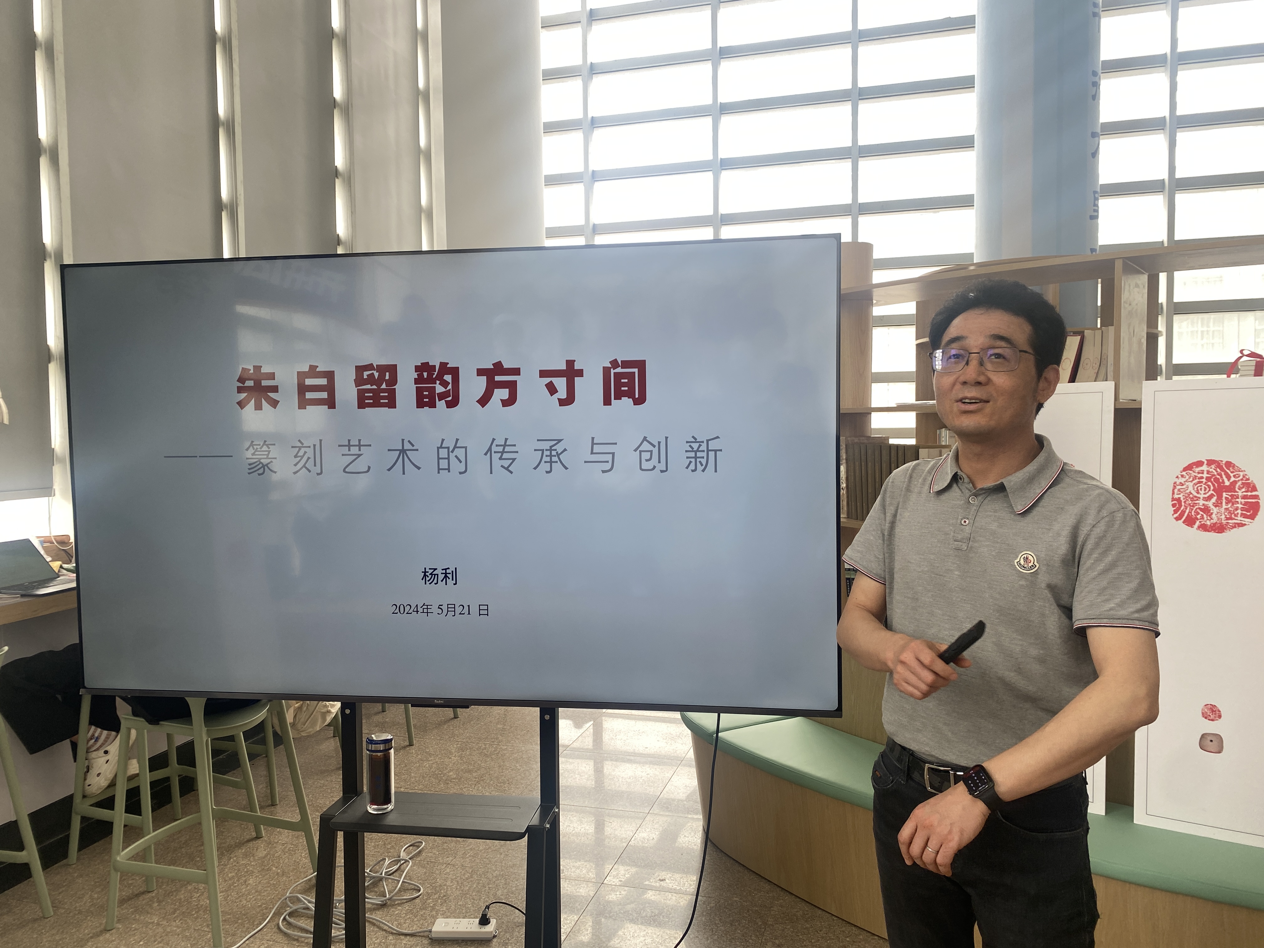 杨利系统回顾了汉字的演变历史,介绍了篆刻艺术的发展脉络,讲述了其背后蕴藏着的深厚文化底蕴和内涵。杨利通过生动的案例,让青年学生们深刻感受到了汉字作为中华文明重要载体的独特魅力,现场展示部分篆刻作品,让同学们对篆刻艺术有了更进一步的了解。在谈到篆刻艺术的传承与创新时,杨利强调,年轻一代应在继承传统基础上,勇于尝试新的艺术表现形式和创作手法,在传承中为篆刻艺术注入新的活力。