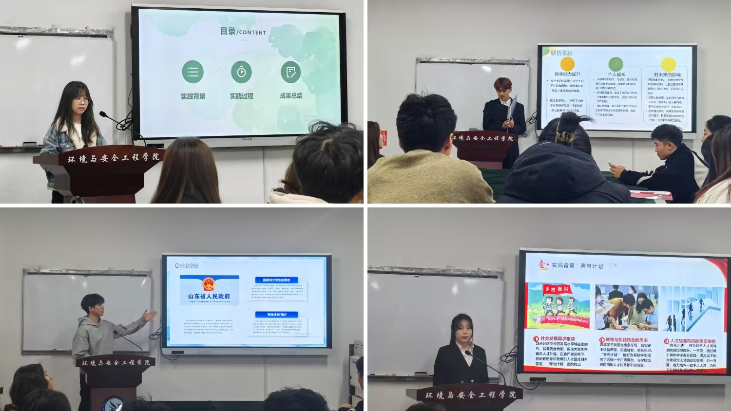 汇报会上,各队伍汇报人紧密结合实践实情,从实践背景、开展过程、成果感悟等方面进行汇报展示。兰雨鑫分享了芝罘区通伸街道的实习经历,她表示,通过实践加深了对芝罘区城市规划和环保项目的认识,坚定了毕业后返乡建设家乡的决心;崔瑜珂分享了在周村区住建局实习经历,通过参与住房普查录入、元宵节民俗展演志愿者等工作,体会到了基层工作艰辛,表示要不断加强专业知识学习,用所学知识奉献社会;桑佳琪分享了在临淄区环保局的工作经历,深切感受到人工智能技术为生态环境治理带来的革命性变革,她表示,要加强人工智能与环保领域深度融合的学习,不断助力生态环境治理;杨少谦分享了在曲阜自然资源局森林防火科的实习经历,表示要将所学专业知识应用到实际工作中,为生态保护贡献智慧和力量。