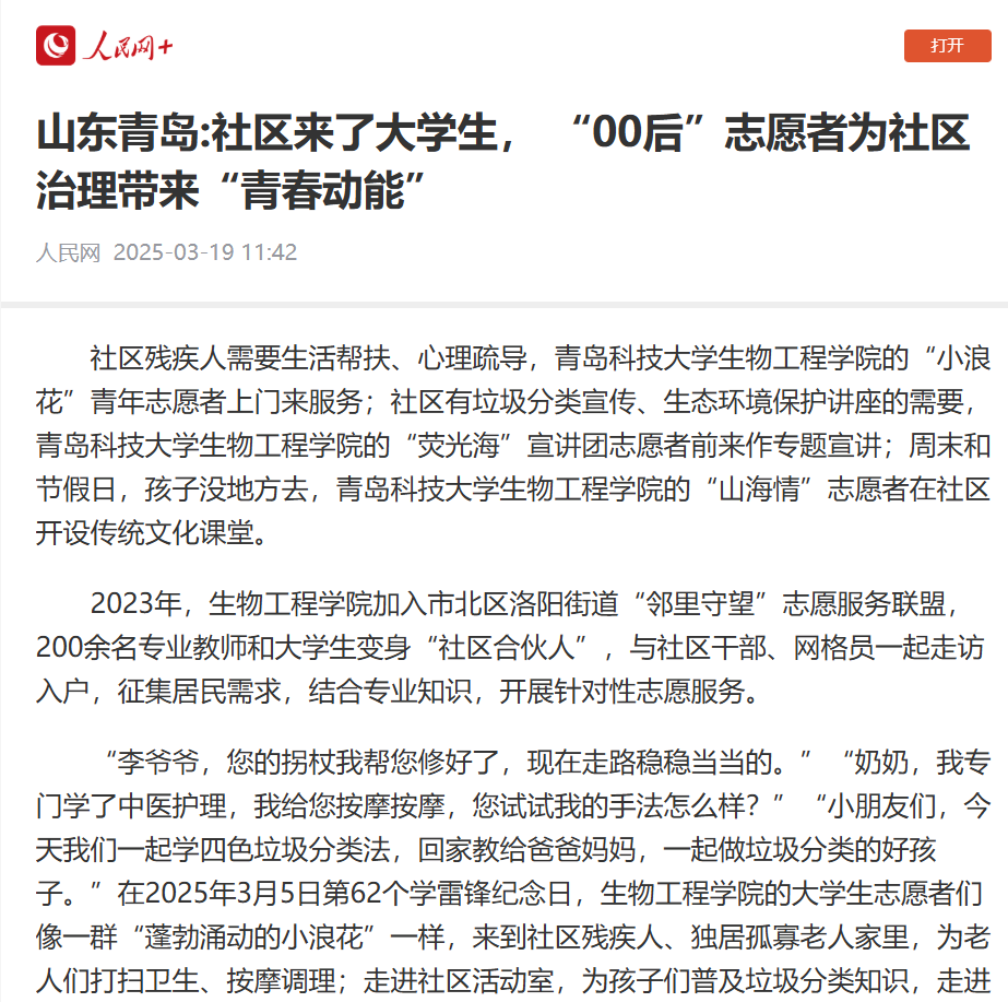 3月19日,人民网发布文章《山东青岛:社区来了大学生,“00后”志愿者为社区治理带来“青春动能”》,聚焦生物工程学院“百万大学生进社区”工作,引发广泛关注。