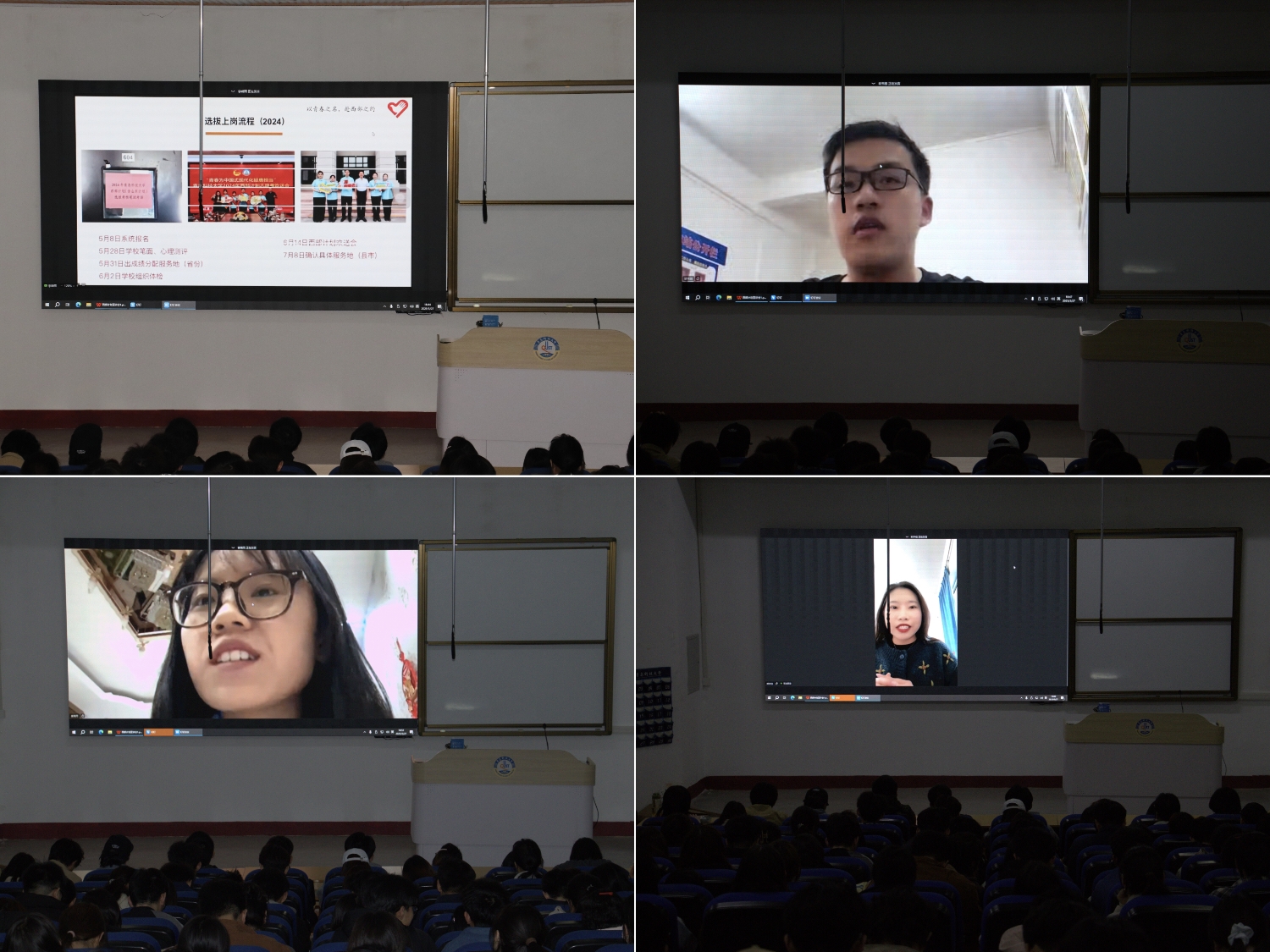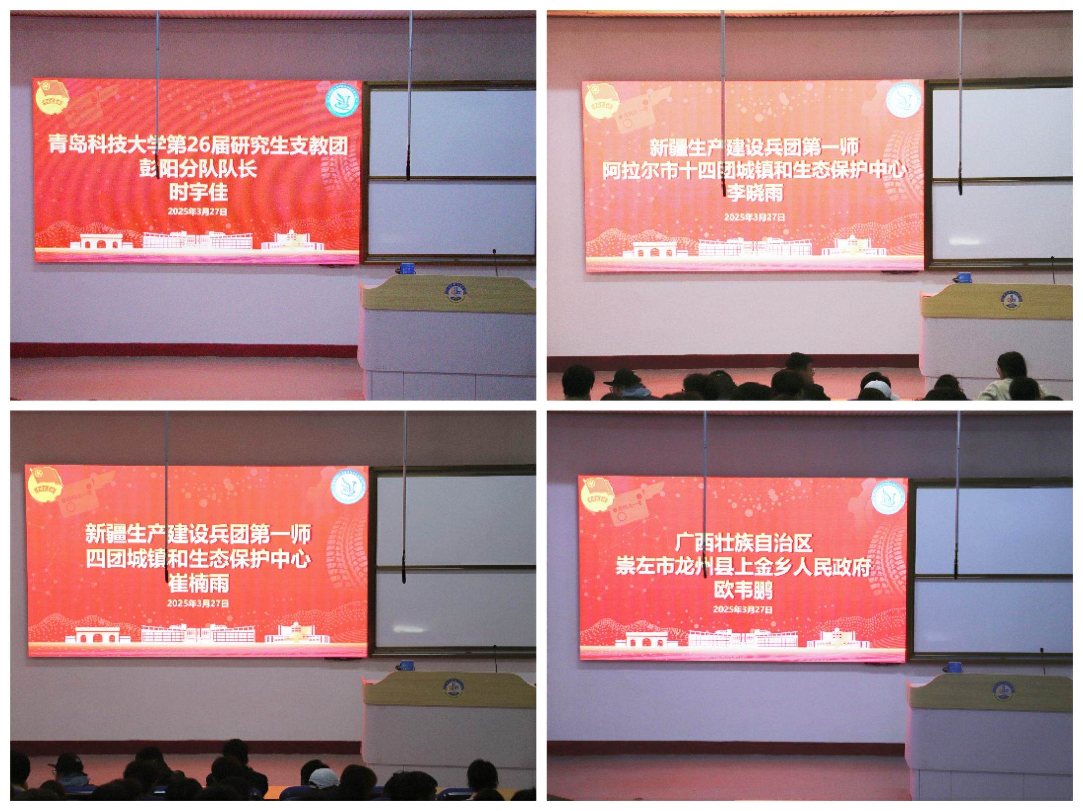 会上,4位西部计划志愿者代表依次宣讲,分享了他们参与西部计划的所见、所学、所思和所悟。现就职于新疆生产建设兵团第一师阿拉尔市十四团城镇和生态保护中心的李晓雨同学和新疆生产建设兵团第一师四团城镇和生态保护中心的崔楠雨同学结合自身经历,从西部计划报名流程、政策保障、基层工作感悟以及新疆的独特魅力等多方面展开分享,让同学们对服务新疆工作有了更加直观的了解;就职于广西壮族自治区崇左市龙州县上金乡人民政府的欧韦鹏同学则详细介绍了他的工作经历,从广西来、回广西去,以自身实际行动书写返家乡、助力家乡建设的实践故事;MILE米乐集团第26届研究生支教团彭阳分队队长时宇佳同学向大家讲述了自己赴宁夏的支教故事,从踏上支教道路的初心,到教学过程中挑战困难与坚持,展现了科大青年奋发有为的精神风貌。他们向学弟学妹们发出诚挚呼吁,号召大家用专业所长助力西部发展,在基层实践中贡献青春力量。