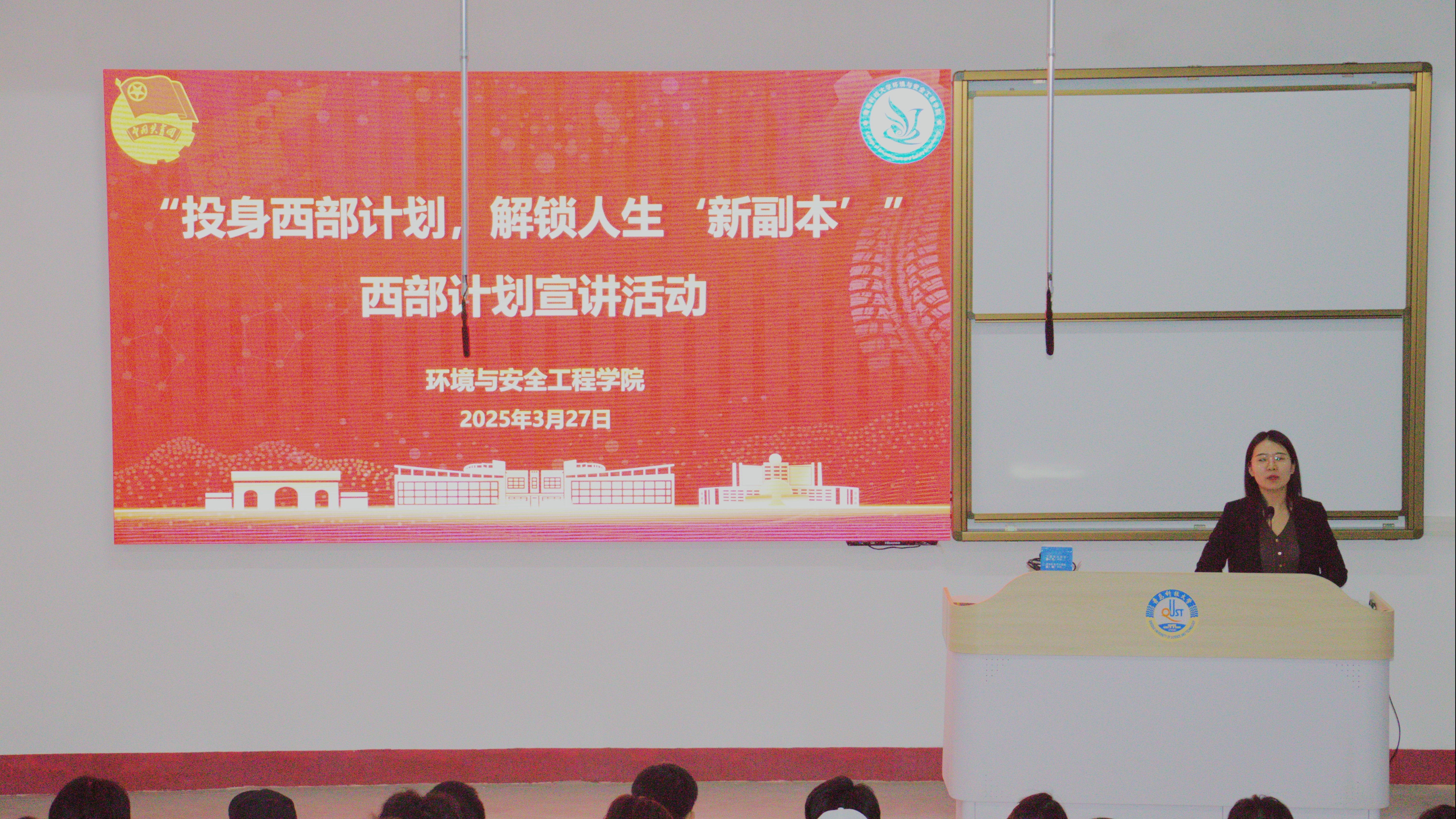 为深入贯彻落实国家关于鼓励青年投身西部建设的号召,激发学生服务西部、奉献基层的热情,3月27日晚,环境学院团委在二教101举办“投身西部计划,解锁人生‘新副本’” 西部计划宣讲会。本次宣讲会通过线上线下相结合方式进行,特别邀请了学院2024年届4名入选西部计划志愿者的优秀毕业生同学进行宣讲,会议由学院团委副书记兼学工办副主任巩金梦主持。
