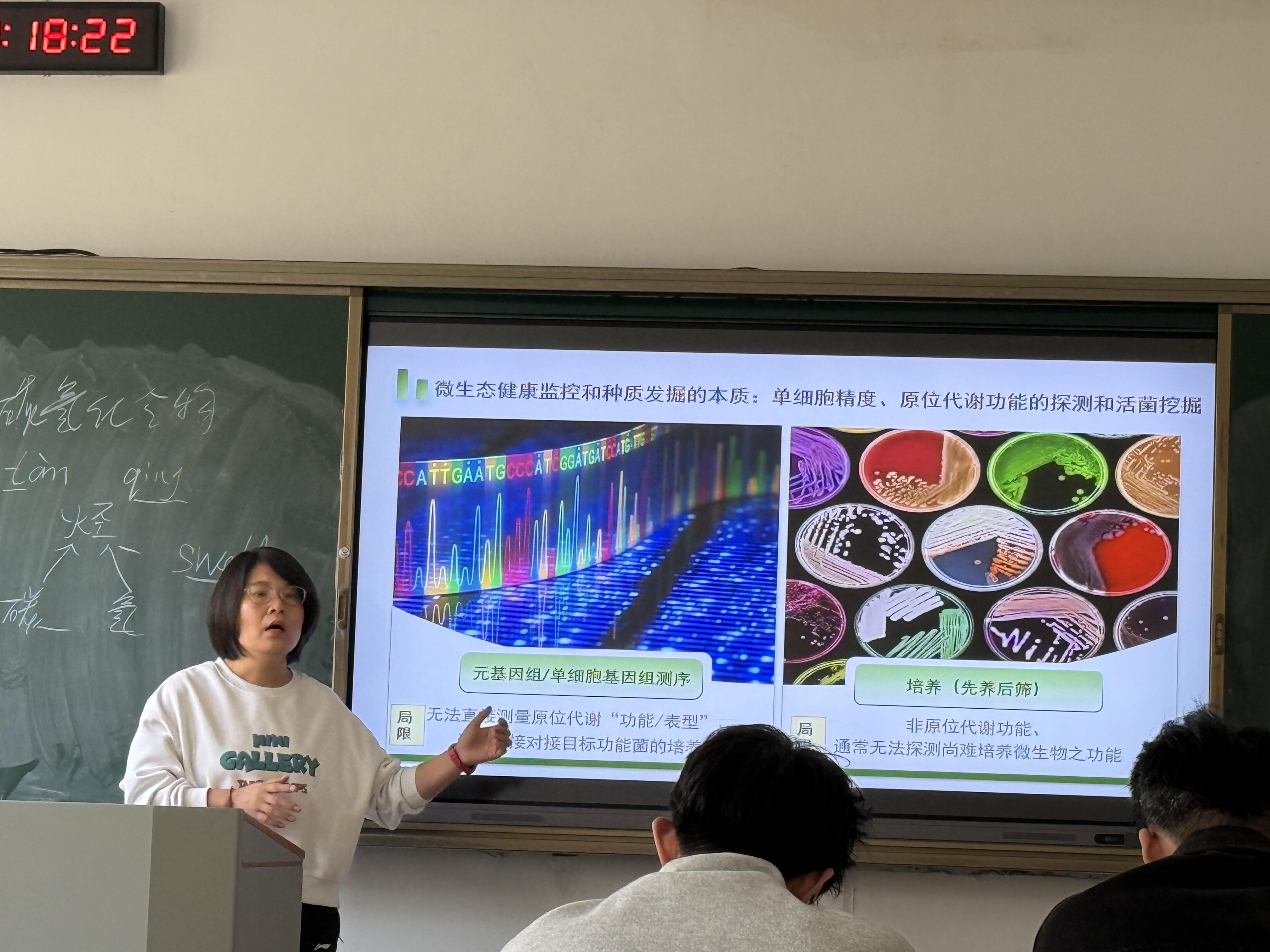 会上,荆晓艳系统阐述了当前污水处理领域的核心挑战与前沿突破。她就“污水处理成本与生态保护的平衡”,“新兴污染物的处理技术瓶颈”等问题引入,重点介绍了团队研发的单细胞拉曼耦合培养技术(scRACS-Culture),该技术通过“先筛后养”策略,直接从环境样本中精准识别并培养具有高效解磷功能的微生物菌株,突破了传统“先养后筛”技术的局限性。在青岛张村河水务有限公司的实际应用中,该技术成功分离出Comamonas spp.、Acinetobacter spp.等高效解磷菌,其原位代谢活性比实验室条件下提升1-2倍,为污水磷资源回收提供了新路径。此外,她结合生物强化技术与膜分离工艺(MBR)的协同应用案例,展示了技术创新如何实现污水处理的高效化与低碳化。她特别提到智慧水务系统在优化调度与节能降耗中的关键作用,通过物联网、大数据和人工智能技术实现污水处理厂的精细化管理,可降低能耗20%-30%。荆晓艳的分享给研究生带来了污水处理领域的创新思路推动科研成果转化,为培养高素质应用型人才提供支撑。