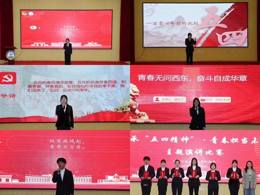 演讲比赛展风采。4月24日,学院团委组织开展“传承‘五四精神’,青春担当未来”五四演讲比赛,选手们生动地讲述在学习、生活中的奋斗故事,表达对“五四精神”深刻内涵的理解,呼吁青年以“五四精神”为指引,勇做走在时代前列的奋进者、开拓者、奉献者,在奋斗中实现人生价值。