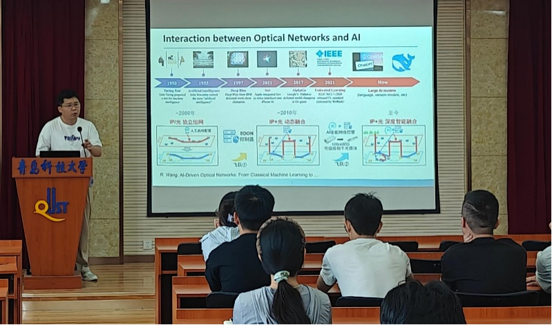 6月6日上午,信息学院团委在402报告厅举办“求思得”论坛之“AI-Driven Optical Networks: From Classical Machine Learning to Emerging Large AI Models”学术报告。报告由信息学院副教授王瑞坤老师主讲,学院百余名研究生参与。