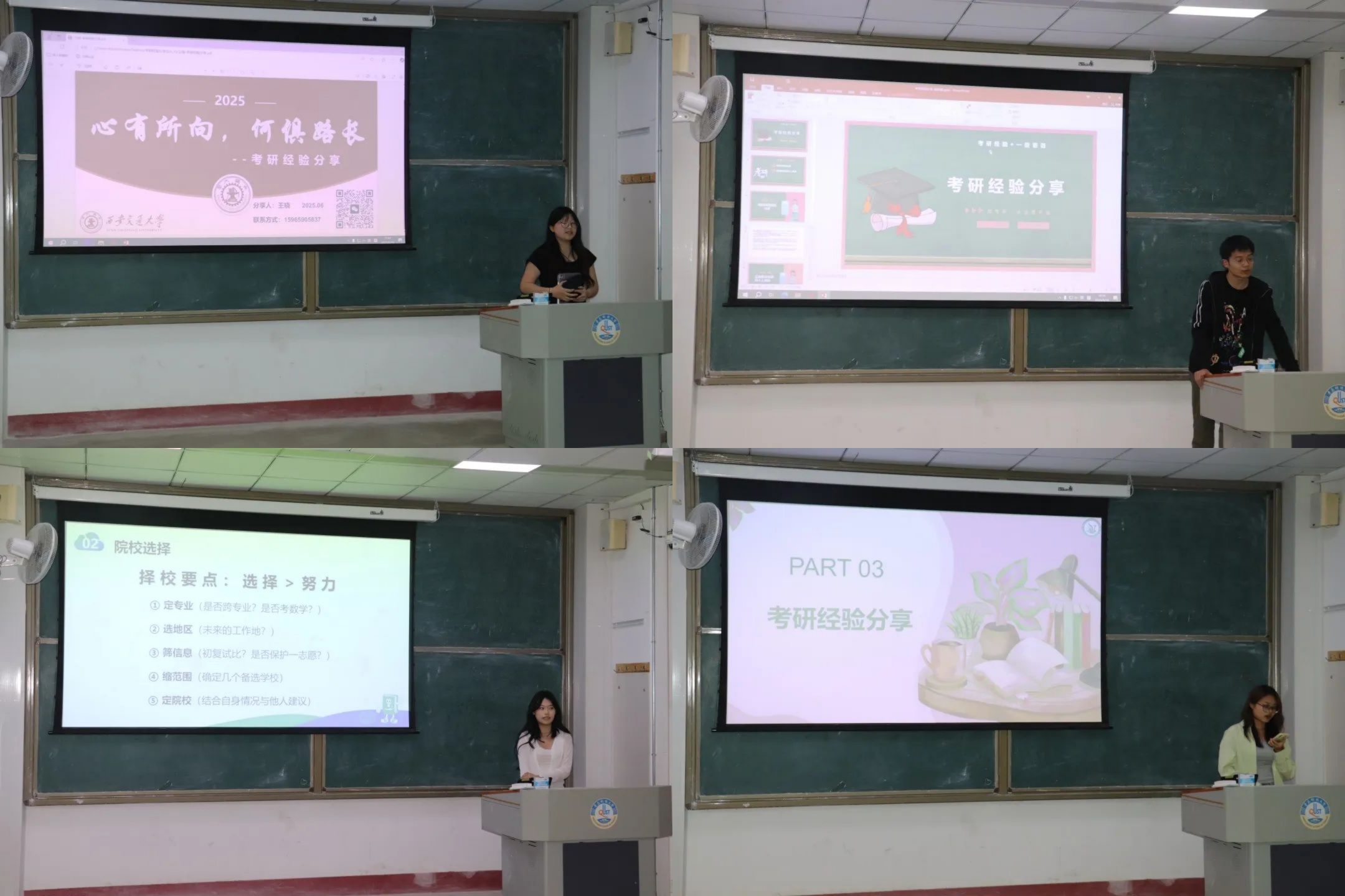 在考研经验交流环节,环境工程专业韩京佐、何梦雨、张怡然、王晓、范子豪,环境科学专业王冰倩,安全工程专业赵宗强等成功上岸的学长学姐,从择校择专业策略、各科复习方法,到应试技巧与心态调整,全方位分享备考干货。