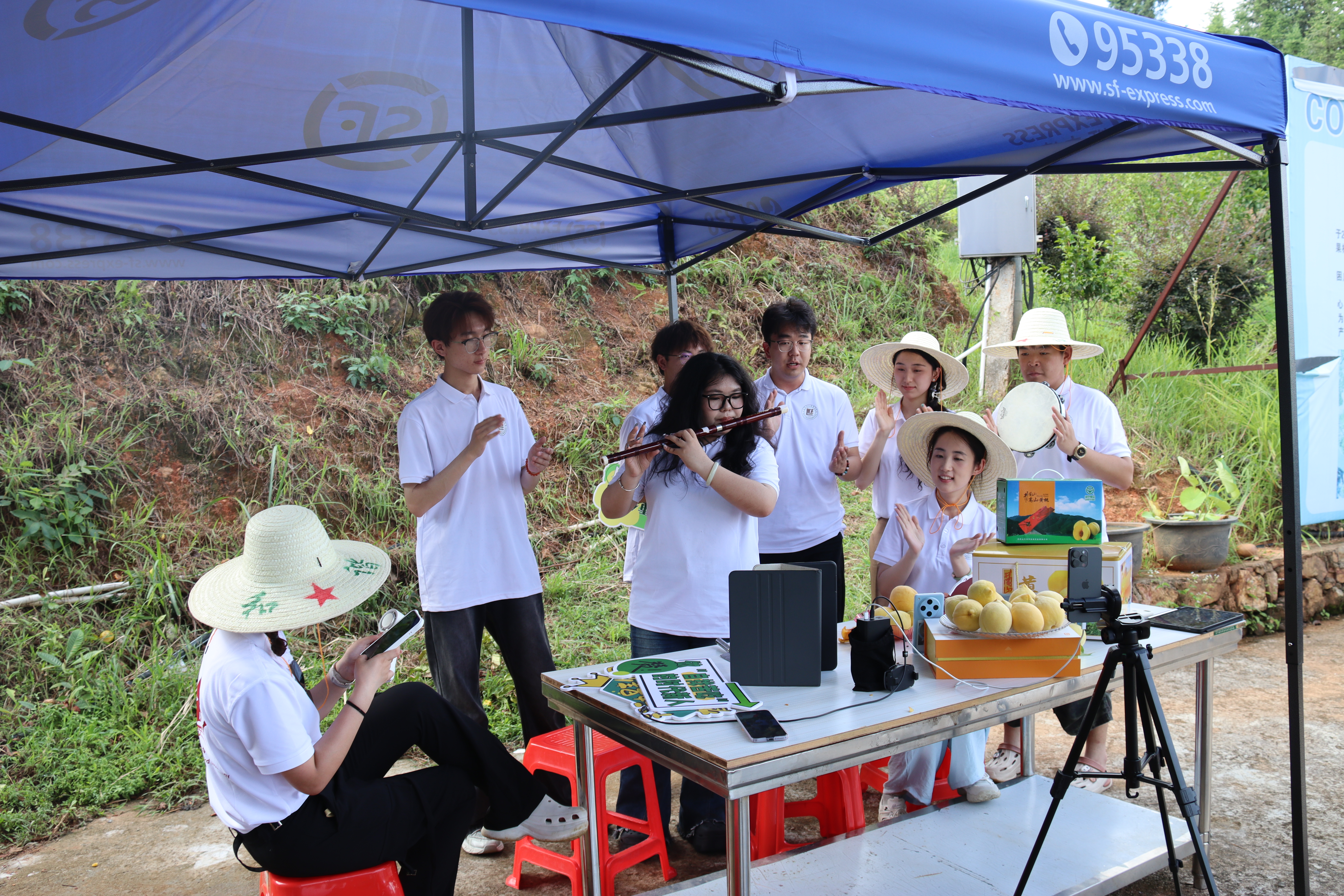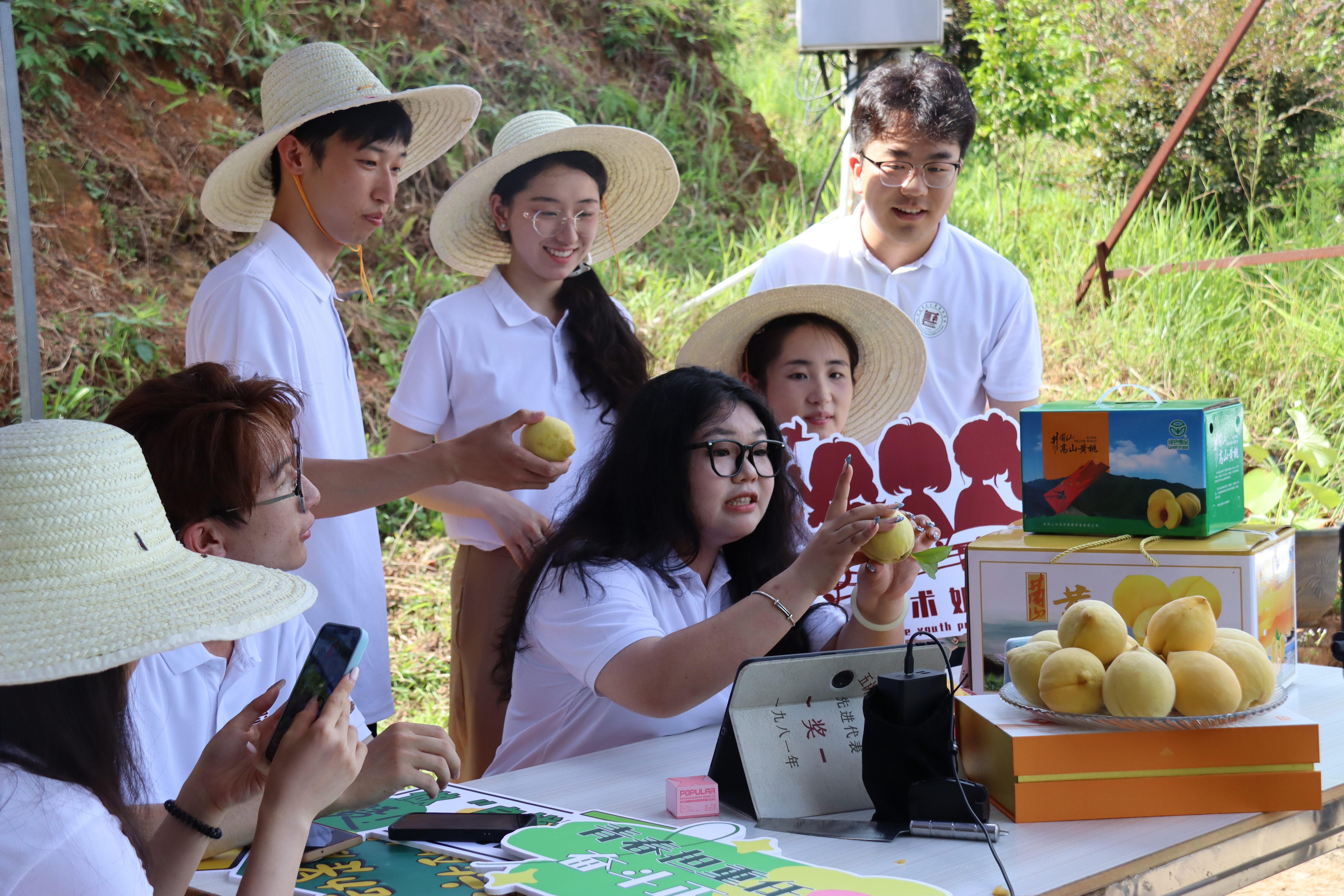 田间地头里,黄桃果树下,镜头前的实践团成员化身热情洋溢的“带货主播”,详细介绍井冈山得天独厚的生态条件孕育出的锦绣黄桃的优良品质、甘甜口感与丰富营养,将艺术技能巧妙融入直播。直播间里悠扬的竹笛演奏、动人的歌声等文艺节目轮番上演,为这场“云端”助农增添了浓郁的艺术气息和青春活力。
