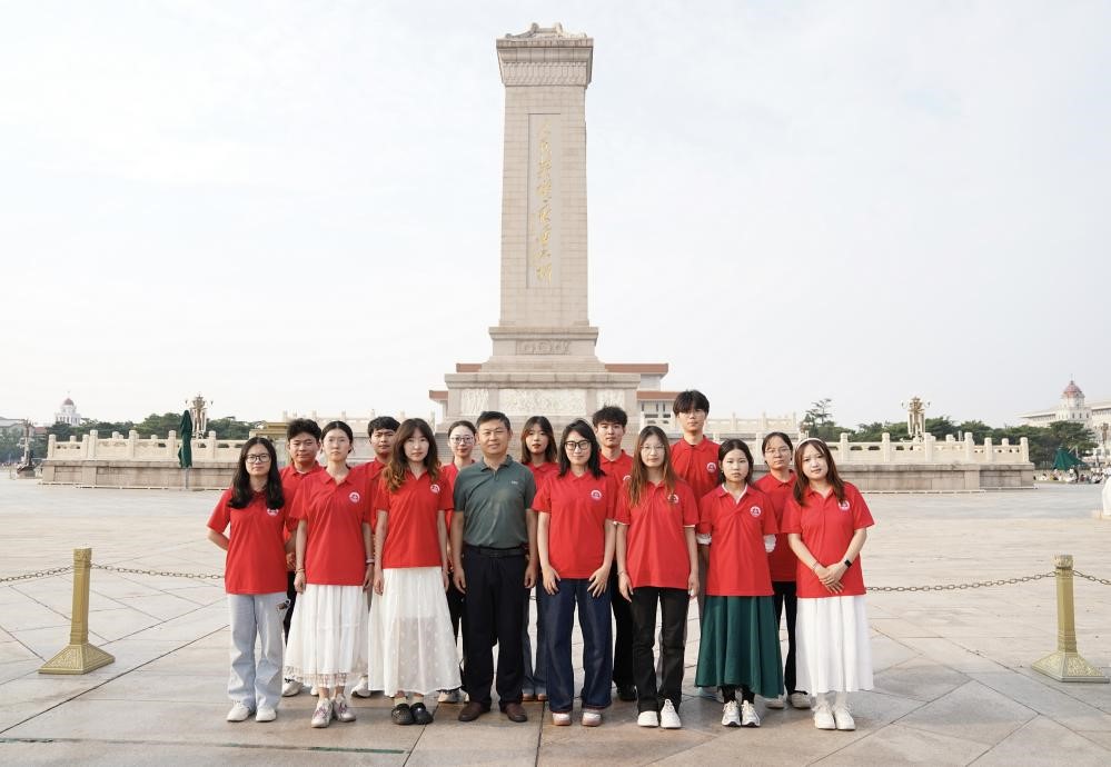 上午7:00,实践团全体成员来到37.94米高的人民英雄纪念碑前,碑体正面“人民英雄永垂不朽”八个鎏金大字熠熠生辉,字字承载着对先烈的敬仰。成员们绕碑而行,碑座上“虎门销烟”“武昌起义”等八幅汉白玉浮雕渐次展开——紧握的拳头、坚毅的眼神、前行的步伐,将近代中国人民为民族独立与解放浴血奋战的历程定格成永恒。大家放慢脚步,目光追随着浮雕细节,仿佛听见百年前的呐喊,在肃穆中完成与历史的对话。在纪念碑北侧广场上,同学们围坐开展分享交流。有人结合浮雕中“五四运动”场景,感慨青年在时代浪潮中的担当;有人谈及“人民英雄永垂不朽”刻字,坦言读懂“安稳生活从非凭空而来”;还有人将此处感悟与此前参观北京化工大学的体验相联:“先烈拼出和平年代,我们更要在专业赛道奋力前行,这才是对他们的告慰。”朴实话语中,“家国”与“担当”的种子悄然扎根。