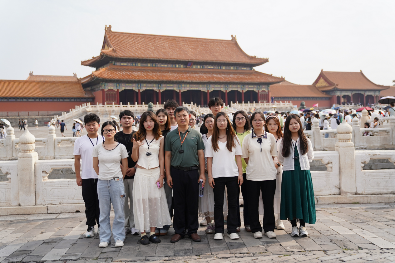 上午10:00,实践团成员在承载六百年文明记忆的紫禁城中开启了一场穿越时空的文化对话。首站沿中轴线探访三大殿,太和殿金漆盘龙柱、中和殿单檐攒尖顶、保和殿云龙石雕,彰显“虽由人作,宛自天开”的营造智慧。三大殿不仅是皇权象征,更凝聚着中国传统建筑艺术的精髓。在东西六宫区域,斑驳红墙与槅扇窗棂宛如历史的留声机,向实践团娓娓诉说着紫禁城里的悲欢离合,让队员们对古代宫廷生活有了更为深刻的认识,也愈发珍惜当下的自由与幸福。钟表馆内精巧的铜镀金写字人钟、珍宝馆中錾刻九龙纹的金瓯永固杯,展现中西交融的工艺巅峰,点翠凤冠的羽光流转见证中华审美精神的永恒魅力。正午时分,当队员们走出神武门回望这座宫殿群,飞檐上的脊兽仿佛在云端守望。这次故宫之行,不仅让实践团成员直观感受到中国古代建筑与工艺的非凡成就,更深刻体会到作为新时代青年,让中华优秀传统文化在创新中永葆生机的文化传承担当。