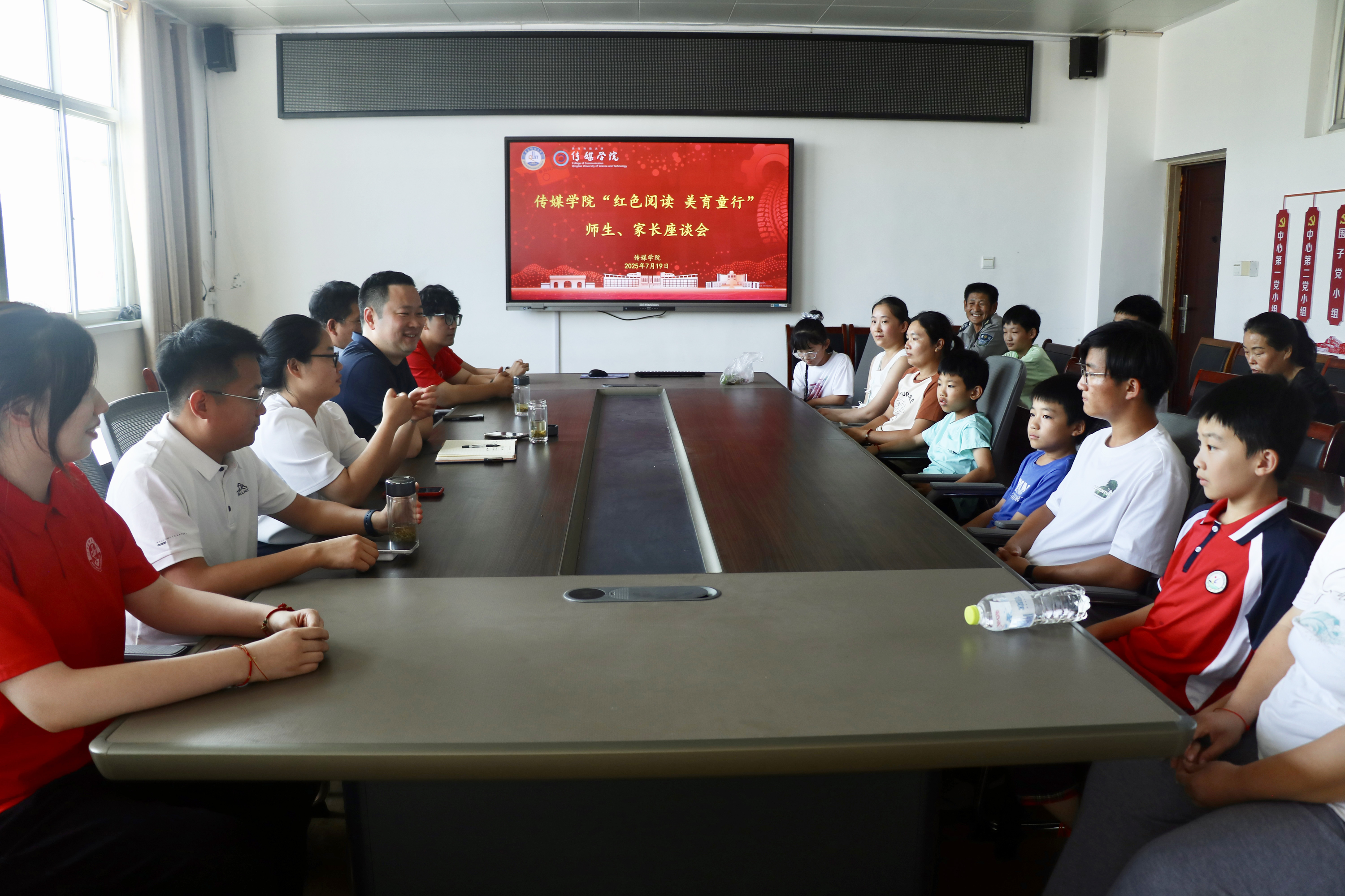 座谈会上,“小漫姐姐”团队师生代表与学生、家长围坐一桌,聚焦学生成长发展需求展开交流。学生及家长们踊跃发言,纷纷感谢青科大传媒学院和涝坡镇中心小学的长期坚守、大爱情怀,感谢“小漫姐姐”师生团队十六年的辛勤付出、无私奉献。每年暑假,涝坡镇中心小学的孩子和家长们都翘首期盼来自青岛“小漫姐姐”志愿服务团队的到来,她们给孩子们带来沉浸式的快乐,埋下希望的种子,打开一扇通往未来的窗,收获最温暖纯真的情谊。针对“如何引导孩子喜欢阅读”“如何更好地开展美育活动”等问题,“小漫姐姐”团队师生代表分享了16年接力实践的心得体会,讲述团队陪伴孩子们成长的故事,呼吁家长关注孩子兴趣培养,共同助力孩子全面发展。
