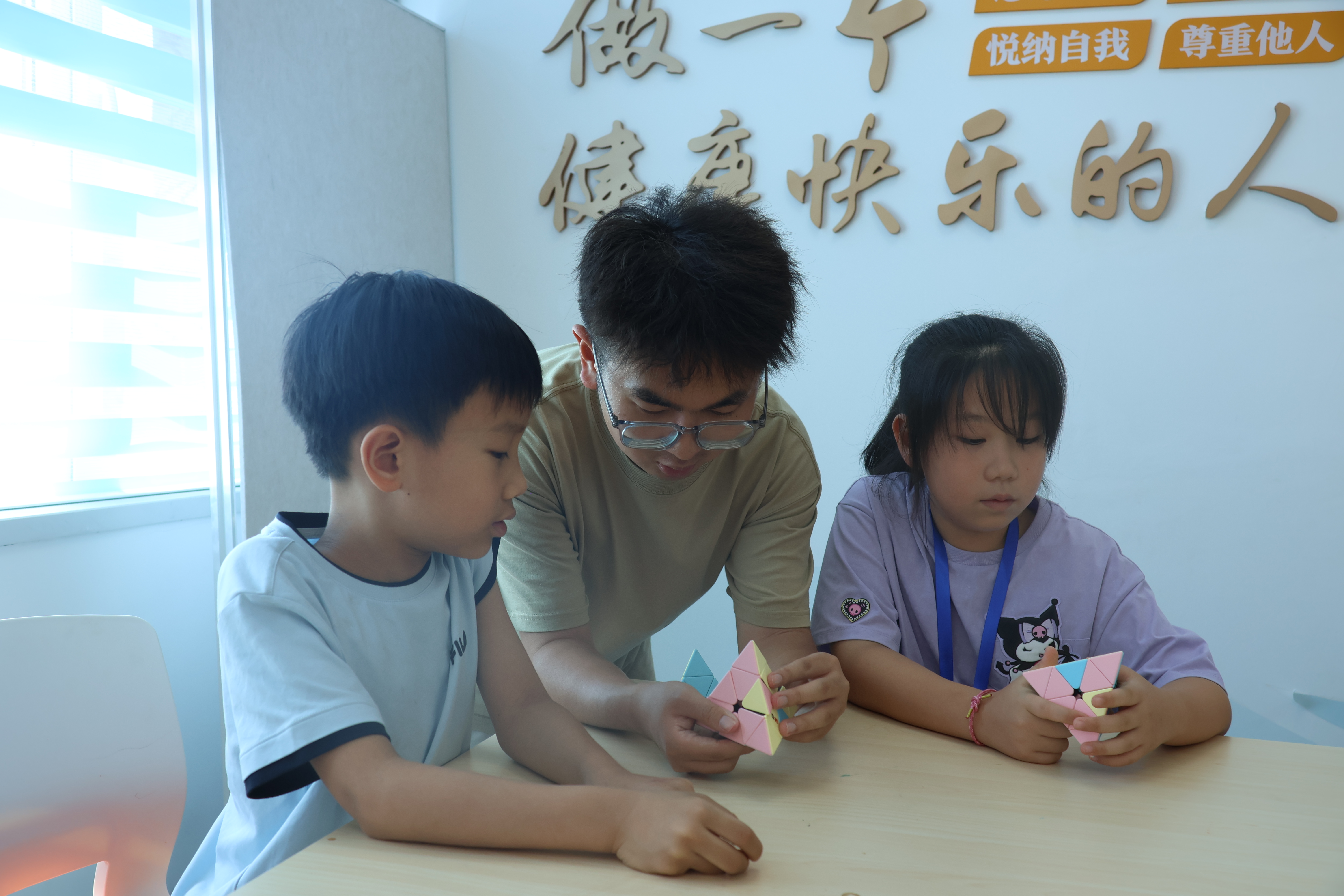 下午则迎来了充满活力的科技探索环节。孩子们在动作识别游戏和简单指令互动中奔跑跳跃,汗水伴随着欢笑挥洒。课程聚焦“AI+运动”,着重于身体的律动与协调,让孩子们在强健体魄的同时,直观感受到科技如何让运动变得更加智能和有趣,科技的魅力在律动中自然渗透。紧随其后的是一场思维挑战——魔方体验课。志愿者们耐心拆解还原步骤,孩子们的小手灵活翻转,全神贯注地破解着彩色方块的奥秘。这不仅锻炼了他们的空间想象力和逻辑推理能力,更在不断的尝试与成功中磨砺了专注力与解决问题的韧性。