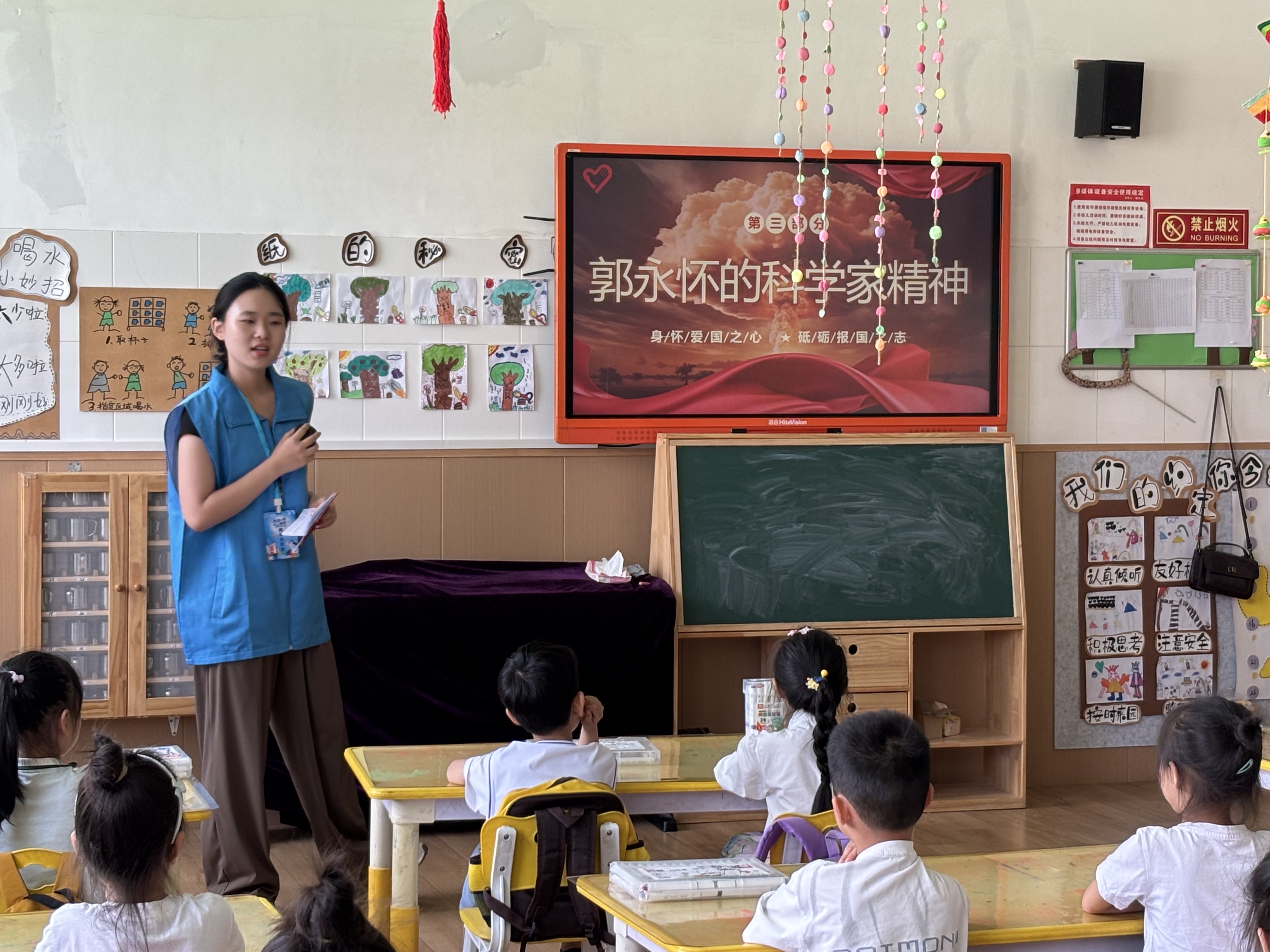 宣讲团以“英雄故事·郭永怀爷爷的抉择”为开篇,用生动童趣的语言,讲述郭永怀为国防事业奉献终身、舍生取义的感人事迹。从投身科研时的坚定信念,到危难瞬间以身躯守护绝密资料的壮烈抉择,孩子们沉浸式聆听,眼神中满是对英雄的崇敬,“热爱祖国、无私奉献”的精神种子,悄然播撒在幼小的心灵。