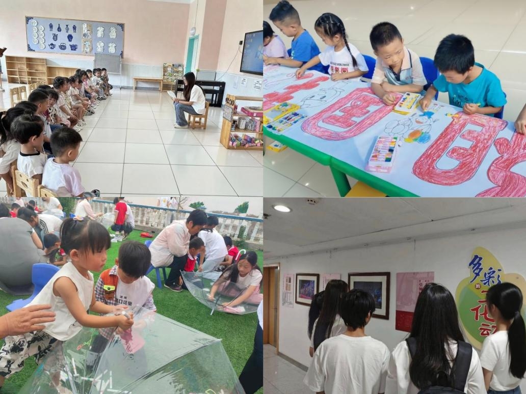 此外,为让红色教育更具感染力,实践队组织开展爱国画卷共绘和雨伞创意作画等创意活动。小朋友们围坐一桌绘制爱国长卷,用彩笔描绘“祖国”“和平鸽”等元素,以绚丽色彩抒发对祖国的热爱;在透明雨伞上绘制可爱涂鸦、爱国标语。画笔游走间,红色记忆与创意融合,让爱国情“随身携带”。