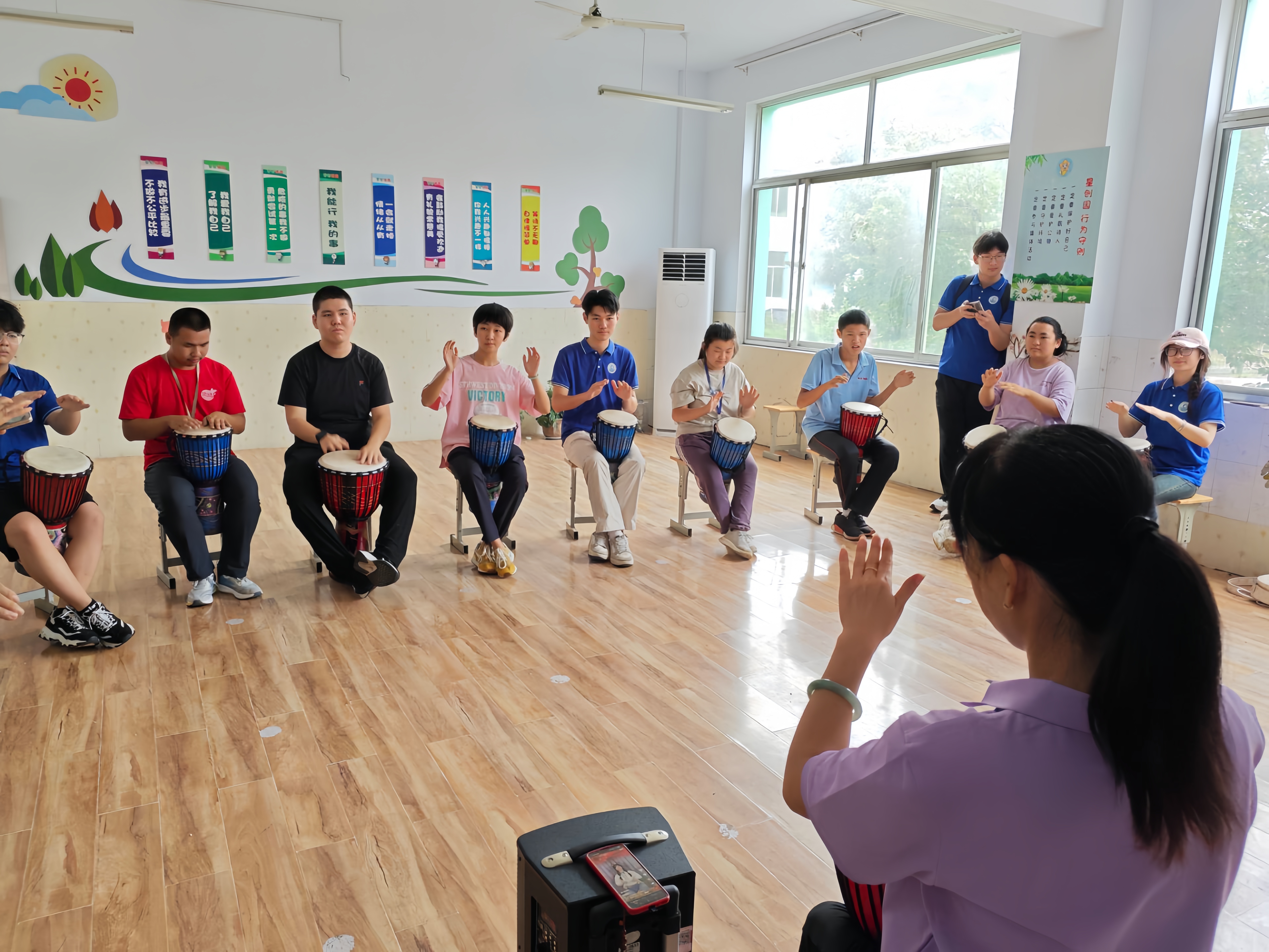 初次见面,手鼓化作沟通的魔法棒。我们围坐成圈,孩子们眼中的好奇与羞涩,随着鼓点共振,一点点消散。一同拍手、击鼓,节奏或疾或徐,声声都叩在彼此心上——原来无需多言,音乐就能传递笑意与信任。看他们学手语舞时,那认真的模样,让每一个动作,都成了爱的符号,在空气里轻轻闪耀。