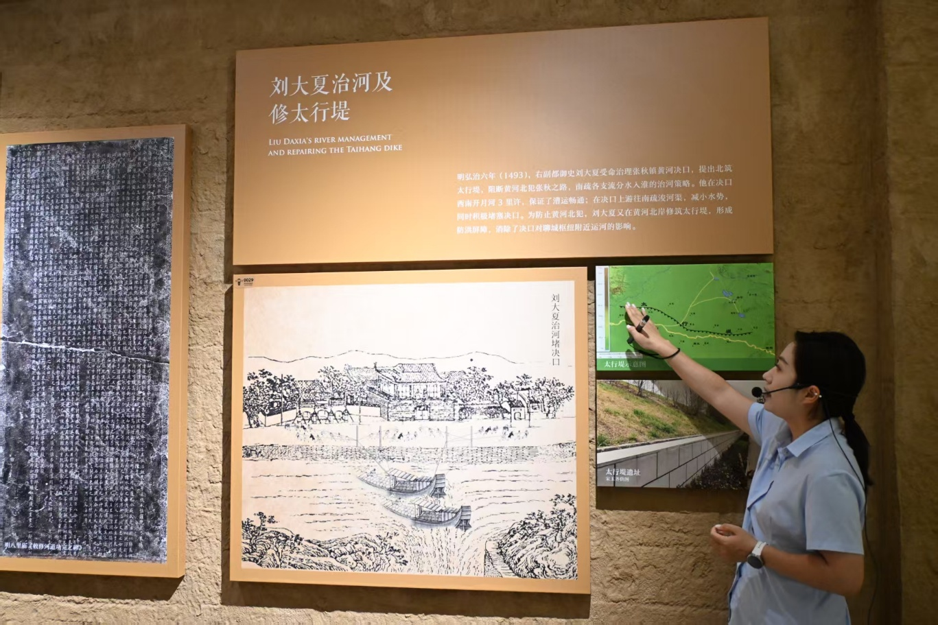 在“水工科技展厅”,十余米长的纵剖面图标注着河道落差,聊城段“闸河”特色成了焦点。讲解员说道:“这段水位落差27.9米,古人靠‘梯次船闸’解决通航难题,这可是世界水利史上的创举。”团队成员不禁感叹道:“原来弯道减流、穿黄工程这些技术,都是古人应对复杂水文的智慧结晶!