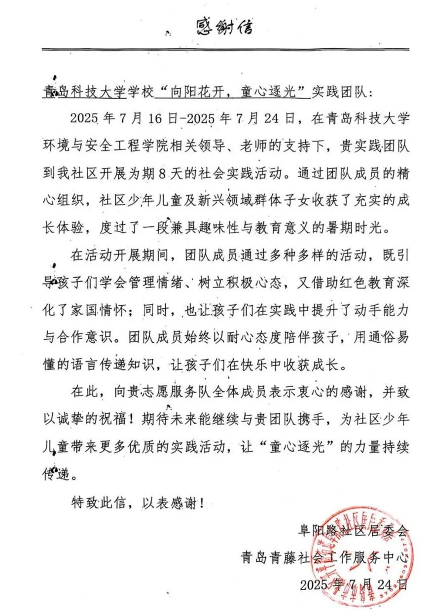 为期 8 天的实践活动在孩子们的笑声与不舍中落下帷幕,而这份“追逐光、成为光”的温暖联结并未结束。阜阳路社区与青岛青藤社会工作服务中心特意发来感谢信,既是队学校实践团队的认可,更是对“童心逐光”这份初心的见证。