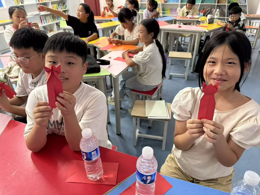 手工折纸课充满欢声笑语。志愿者俯身为孩子调整折纸角度,红色彩纸在小手间翻转,渐渐成型为小狐狸、千纸鹤等形象。“老师你看!”两位孩子举着刚完成的折纸作品笑眼弯弯,教室里满是创作的成就感。