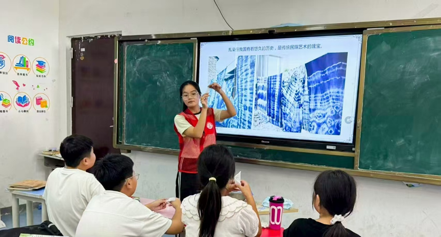 扎染课则让孩子触摸传统工艺的温度。志愿者站在屏幕前,讲解“扎染是传统民族艺术的瑰宝”(如图5),随后指导孩子将白布折叠、捆绑,浸入染料。当蓝白相间的纹样在布料上晕染开来,孩子们兴奋地举起作品(如图6),“原来白布能变这么好看!”