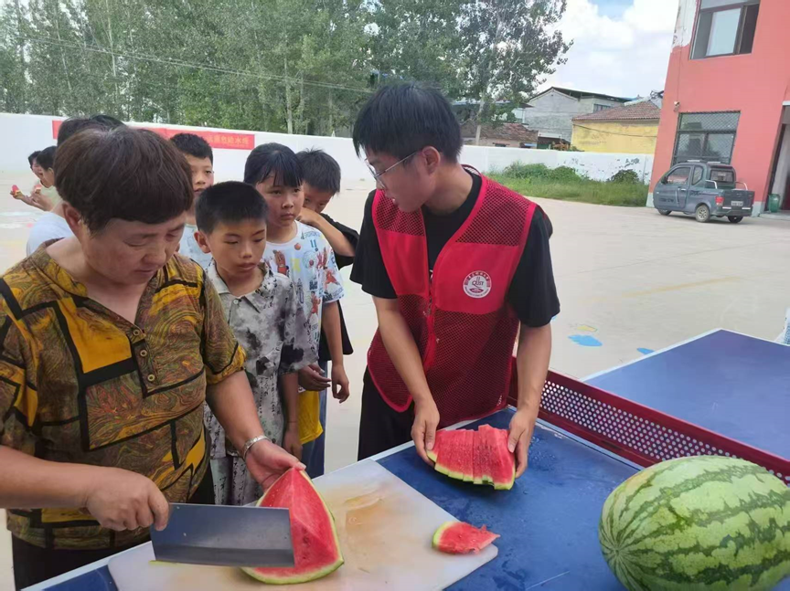 支教不仅是知识的传递,更是情感的联结。课间时分,支教团联合校方开展“夏日送清凉”活动——乒乓球桌上摆着圆滚滚的西瓜,志愿者与老师一起切块分发。孩子捧着西瓜大快朵颐,汗珠混着瓜汁,笑容在盛夏阳光里格外明亮。