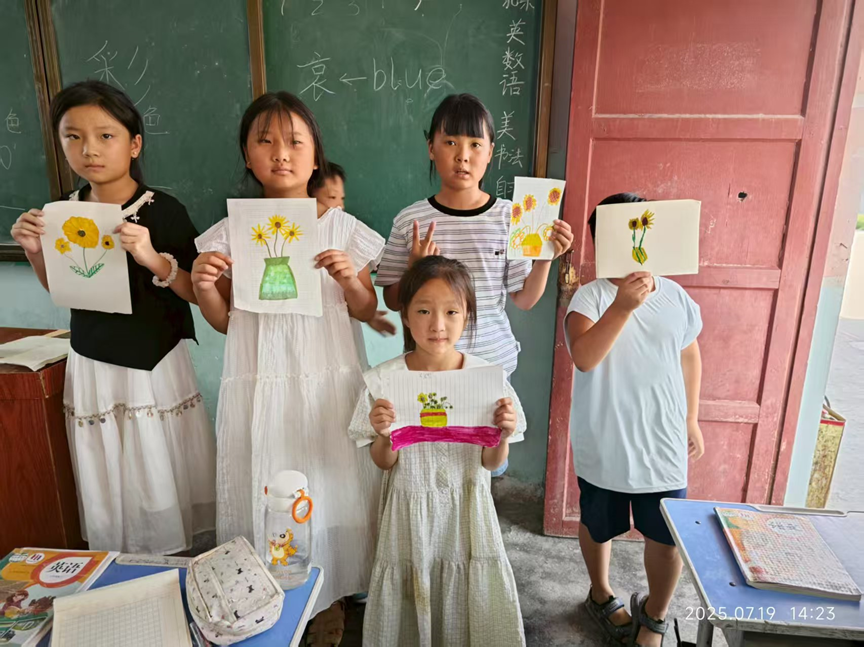 美术课上,志愿者以“夏日花卉”为主题引导创作。黑板上“彩”“色”等板书旁,孩子们用画笔勾勒向日葵、花瓶的轮廓,再以明丽色彩填充。课程尾声,五位孩子举着画作自信展示,稚嫩的笔触里藏着对生活的热爱与想象。