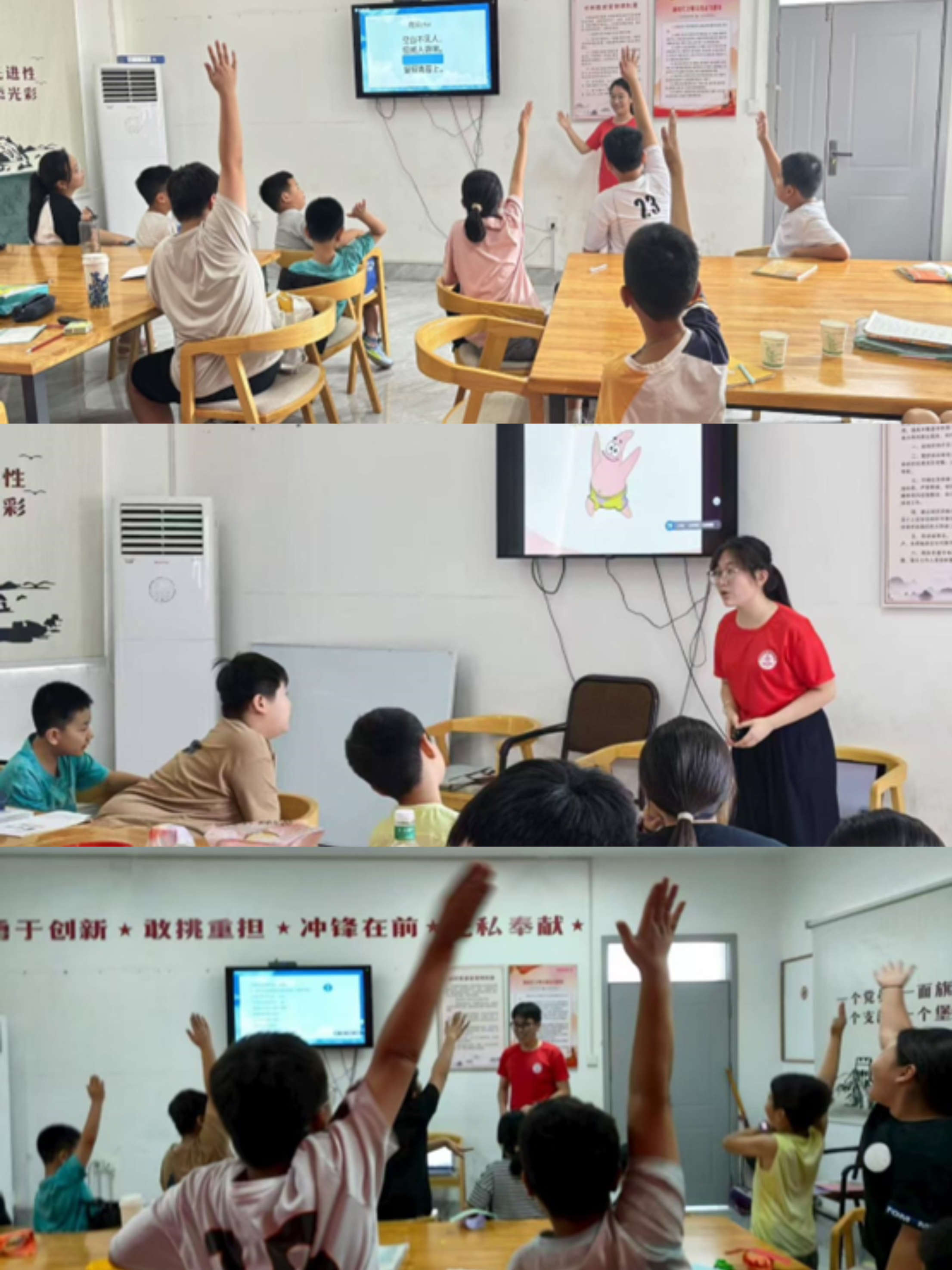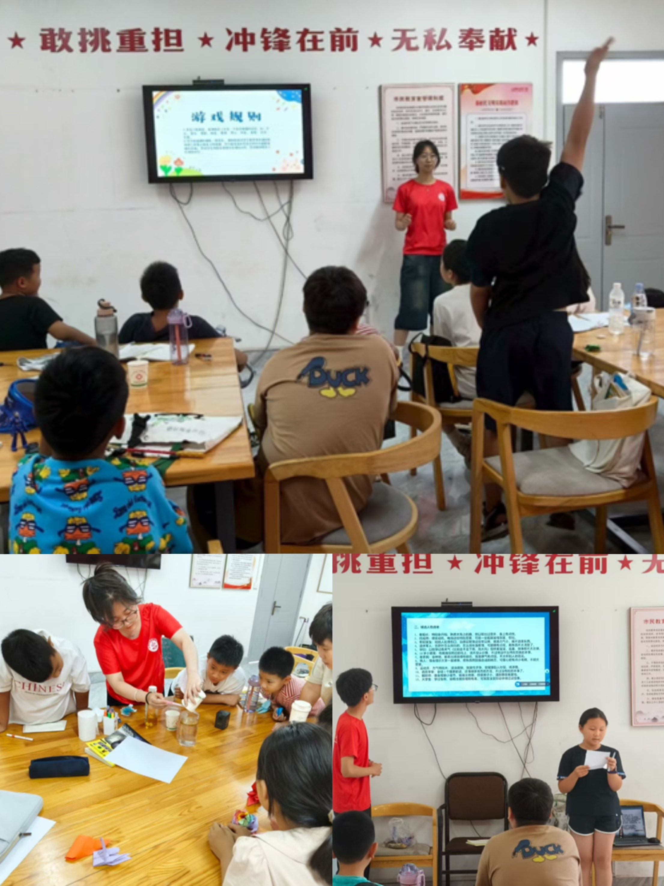 在支教这几天,团队成员们每天晚上提前准备好课程。晨读课通过奖励式学习法引导孩子们背诵古诗,并以趣味游戏检验学习效果,充分调动了孩子们的参与热情。手工折纸课通过动手实践,提高孩子们空间和平面想象能力。科学讲解课结合团队成员们的专业知识,细致地讲解实验现象原理,并且多数实验可以让孩子们动手操作,感受实验的魅力。心理课带孩子们做心理小游戏,不仅锻炼孩子们的反应速度,同时强化了他们的记忆能力。作业课辅导孩子们写作业,让团队成员们更好的了解孩子,因材施教。成员们不断摸索,学会用更生动有趣的方式授课,激发孩子们的学习兴趣。同时,他们也清醒地认识到自身在知识储备和沟通能力方面存在的不足,这激励着他们在未来不断学习提升。
