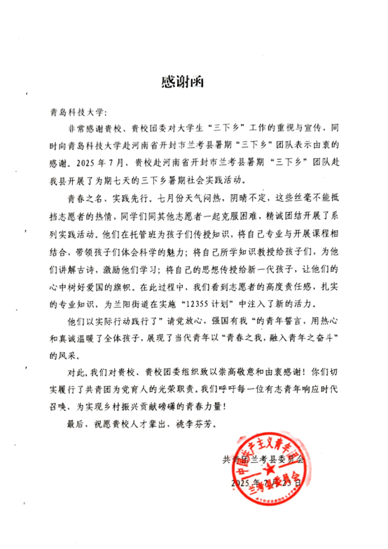 此次支教活动,得到了当地共青团兰考县委员会的高度认可。共青团兰考县委特意为该团队写了一封感谢信,信中对团队成员们的辛勤付出和专业教学给予了充分肯定,赞扬他们为国家“12355计划”注入了新的活力,为乡村孩子们带来了知识和关爱。这封感谢信不仅是对团队成员们的鼓励,更是对他们支教工作的高度认可。