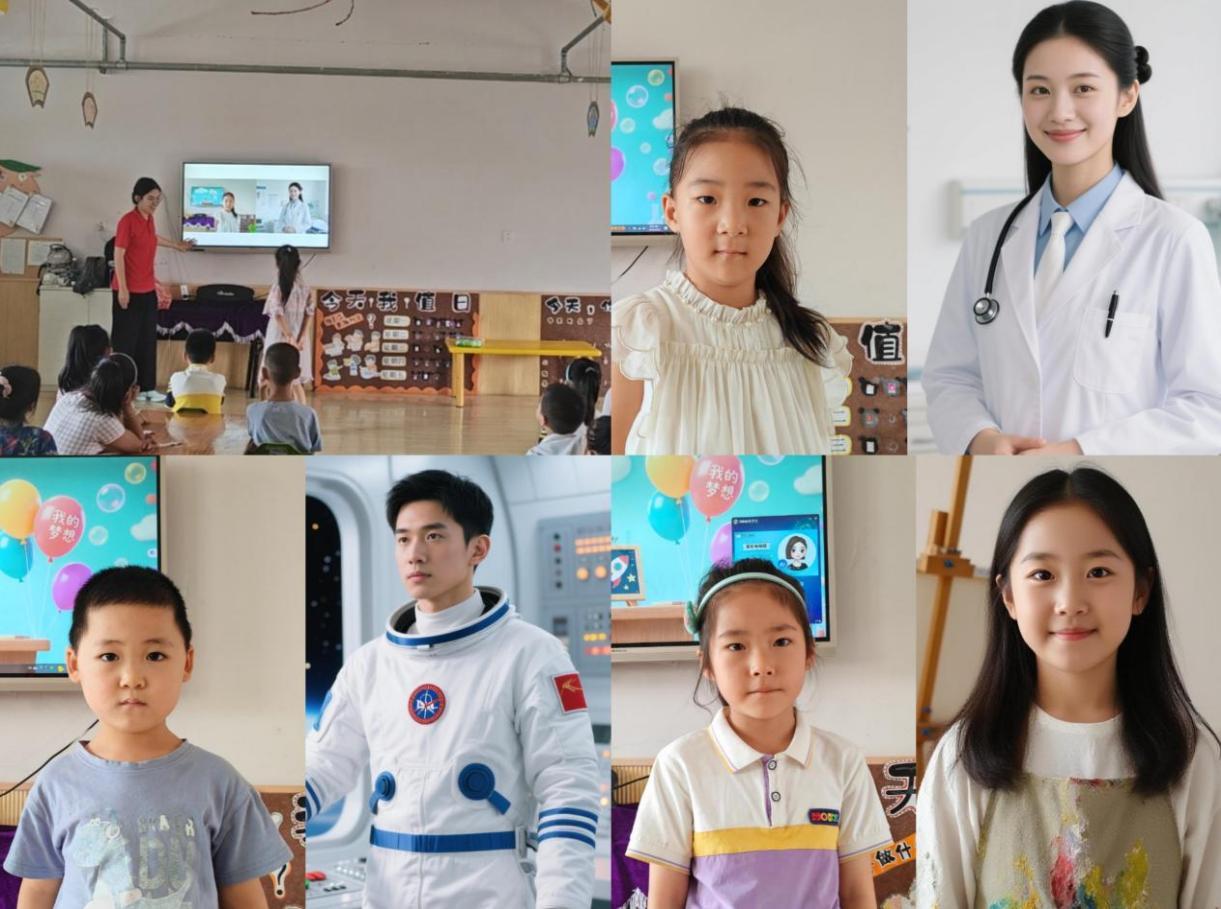 志愿者们认真记录下每个孩子的奇思妙想,再结合孩子们的照片,用AI工具将抽象的想象具象化。当印有自己模样的“职业形象图”出现时,孩子们瞬间沸腾了:“这是我!我以后真的能这样吗?”AI不仅让梦想有了模样,更让孩子们真切感受到:“我的想法很特别,也很有价值。”