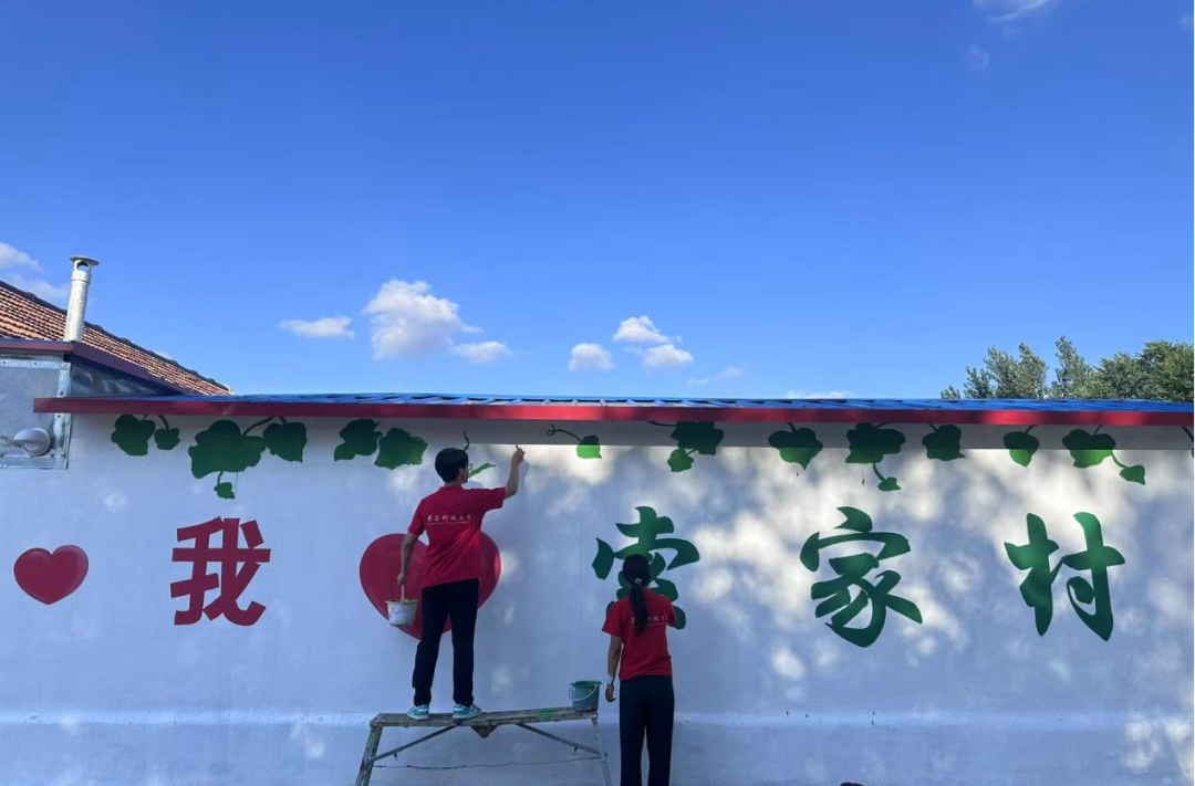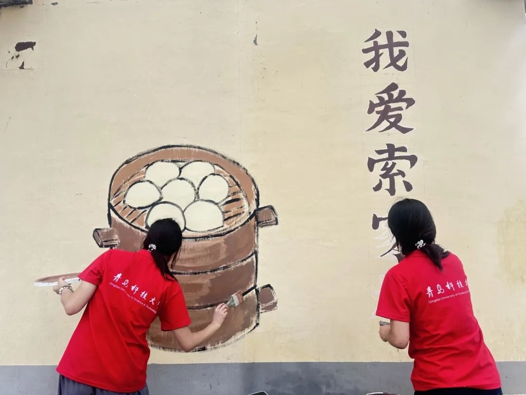 实践队首站来到密水街道索家村,这里正在上演一场“志愿+文化”双驱模式助力乡村风貌提升的生动实践。队员们拿起画笔,以“绿色发展,乡村振兴”为主题,在斑驳的墙面上挥洒创意。昔日单调的墙面渐渐“焕新”——田间的麦浪、孩童追逐的笑脸、象征梦想的翅膀与索家村特色面食产业等本地民俗元素交相辉映,一幅幅栩栩如生的壁画让村庄焕发新生机。“这些年轻人真是太有心了,把我们的村子画得这么漂亮,看着就让人心里舒坦!”路过的村民纷纷驻足赞叹。