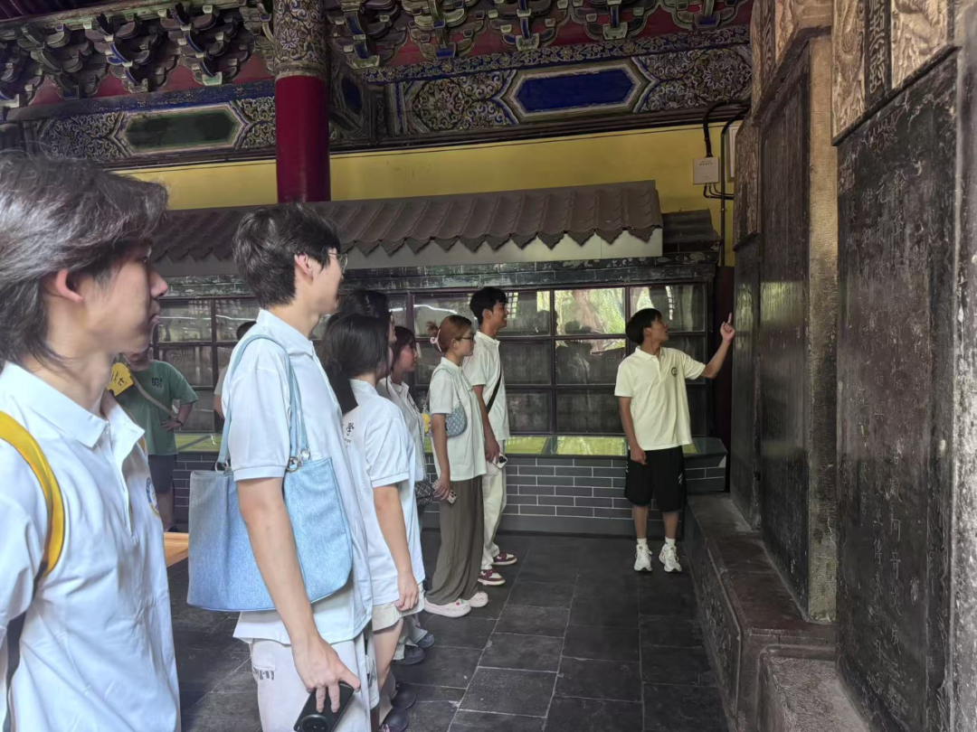 实践团首站抵达孔庙,成员们沿中轴线依次参观棂星门、大成殿、杏坛等核心建筑,细致聆听每一处古迹背后的历史故事——从大成殿内“万世师表”匾额的由来,到杏坛再现孔子“有教无类”的办学场景,再到碑林中历代文人对儒家思想的传承印记,具象化的文化载体让抽象的儒家理念变得可感可知。在参观碑群时,实践团成员围绕碑刻内容展开讨论,结合《论语》中的经典语句,深入解读儒家“仁、义、礼、智、信”思想在不同历史时期的传承与发展,进一步加深了对齐鲁文化核心内涵的理解。