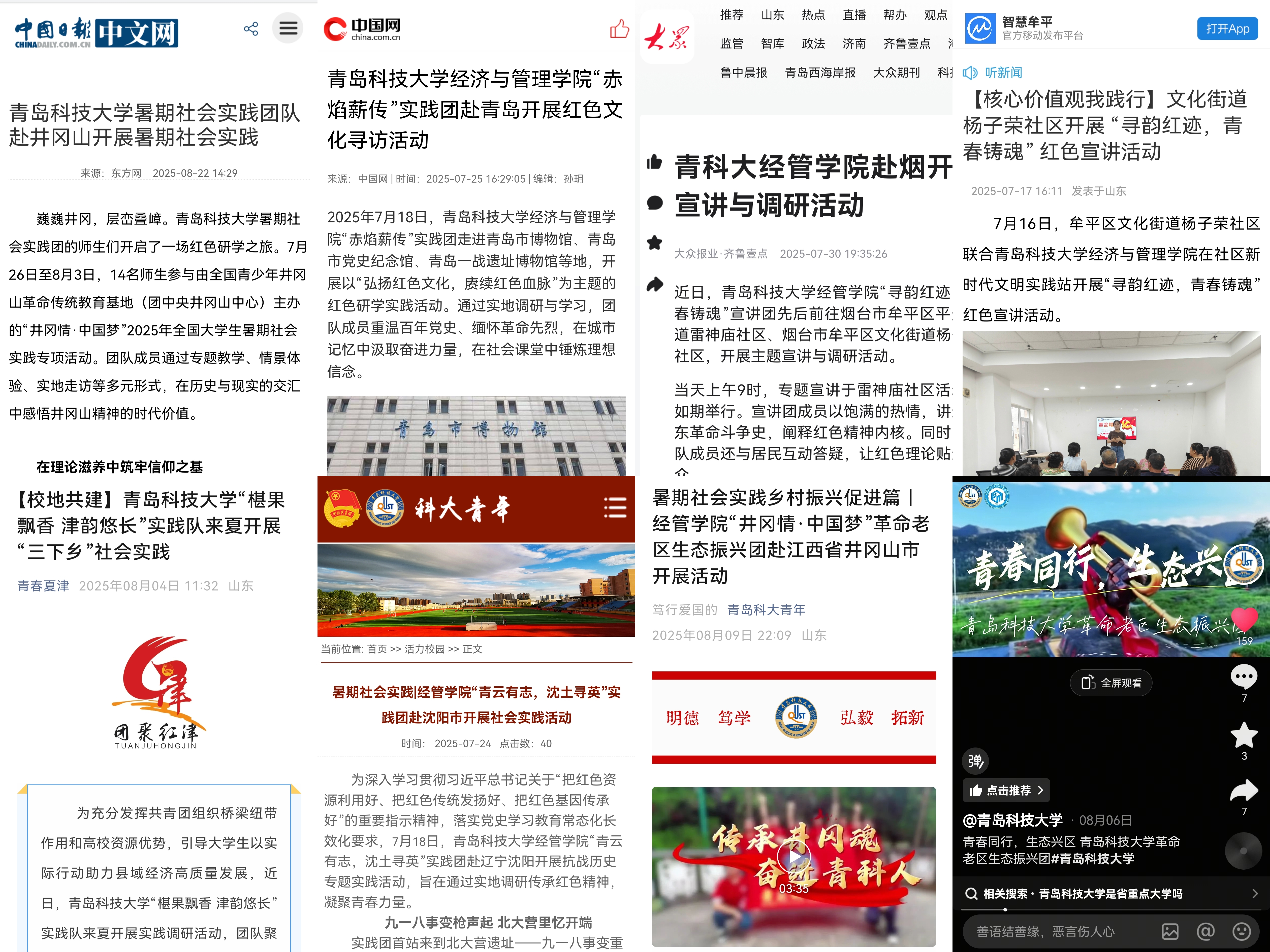 为深入学习贯彻习近平新时代中国特色社会主义思想,引导青年学生在社会实践中厚植家国情怀、提升综合素养,2025年7月至8月,经管学院组织80余支实践团队(含省级重点团队3支、团中央专项团队1支)共715名师生分赴全国28个省份,围绕乡村振兴调研、基层治理观察、文化遗产保护、精神谱系传承等主题开展“三下乡”社会实践活动。实践活动覆盖乡村基层、社区、学校等场所86个,获地方政府、合作单位高度评价,相关事迹被中国网、大众网、地方政务媒体累计报道119篇次。