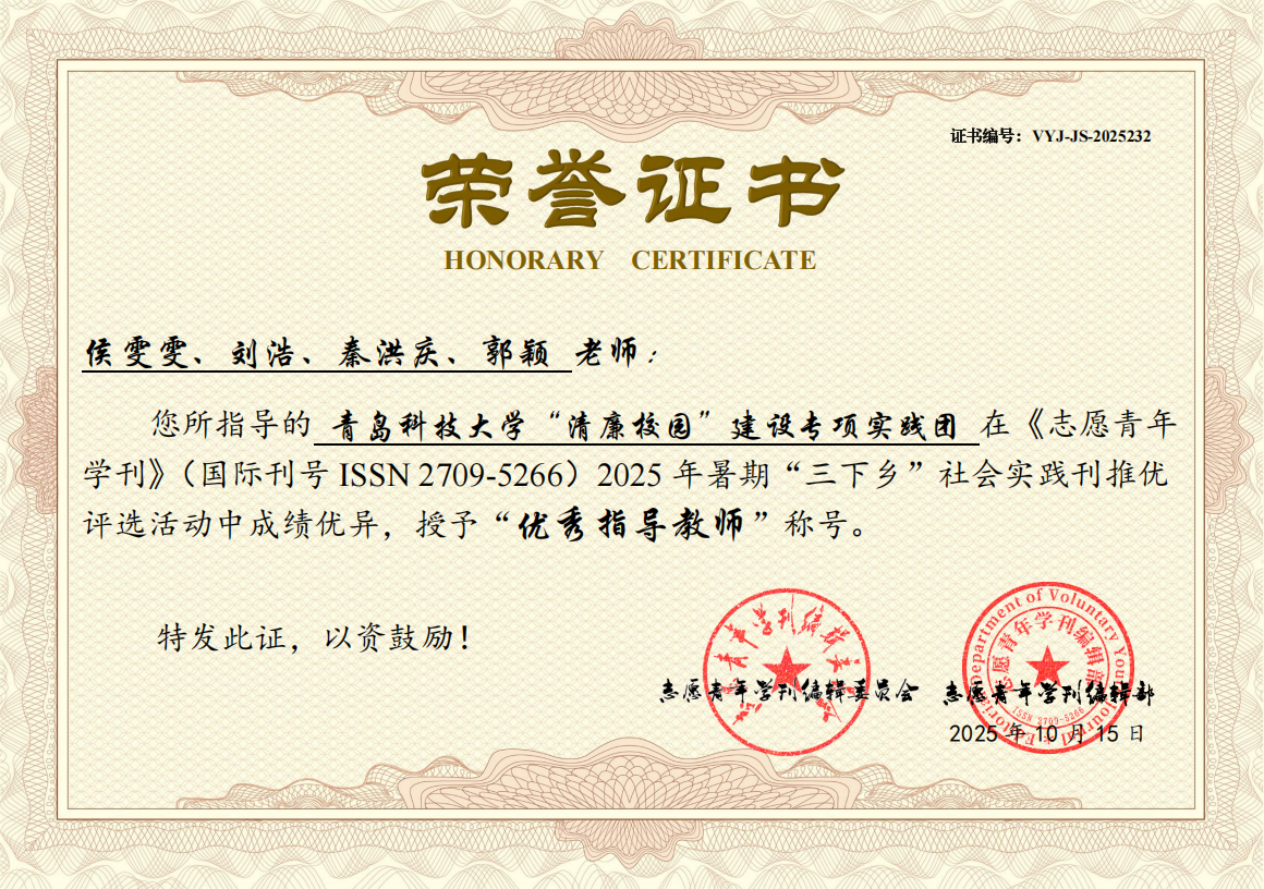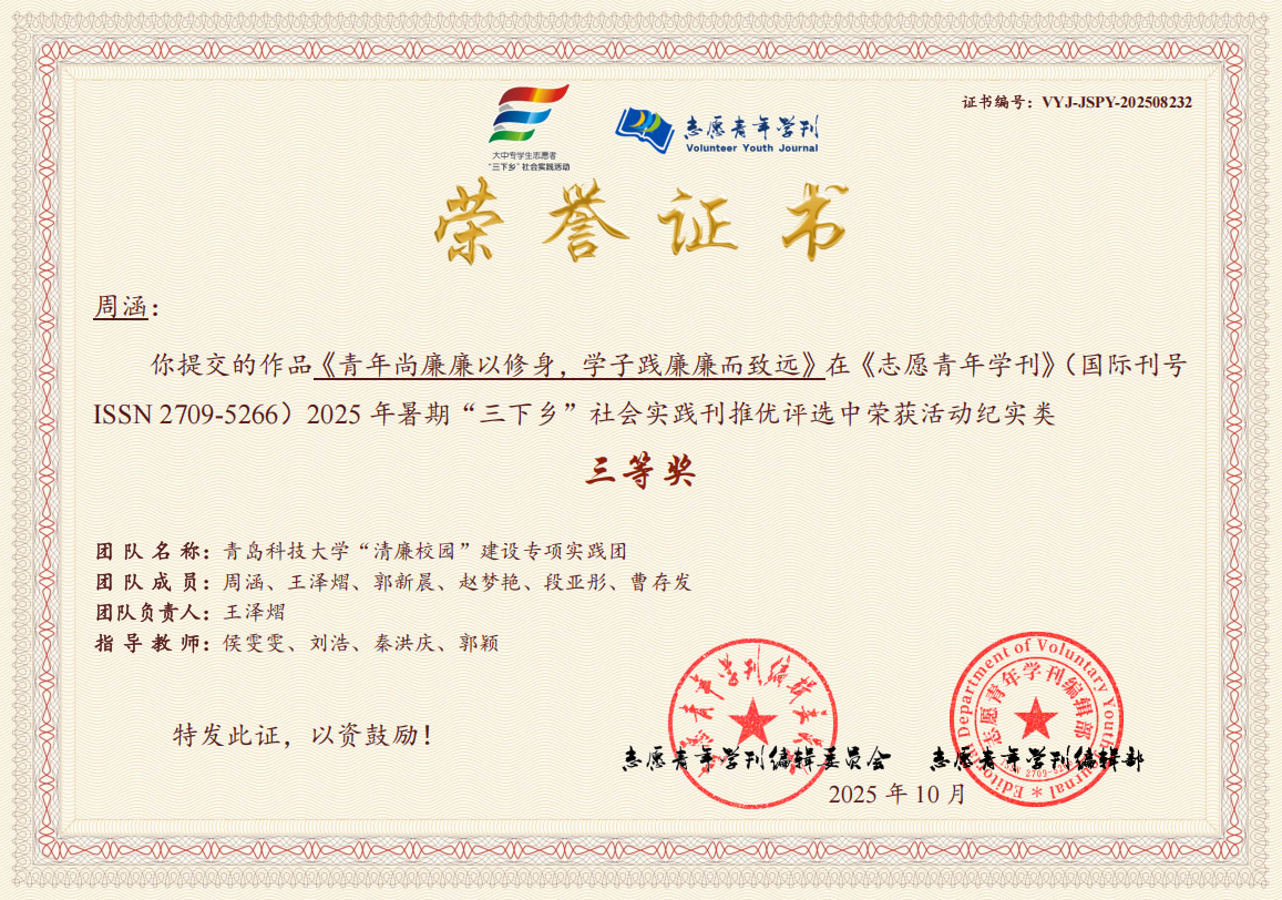近日,《志愿青年学刊》(ISSN 2709-5266)编委会公布了2025年暑期“三下乡”社会实践专刊活动纪实类推优评选结果,生物工程学院团委“清廉校园”建设专项实践团获评三等奖,侯雯雯、刘浩、秦洪庆、郭颖获评优秀指导教师。