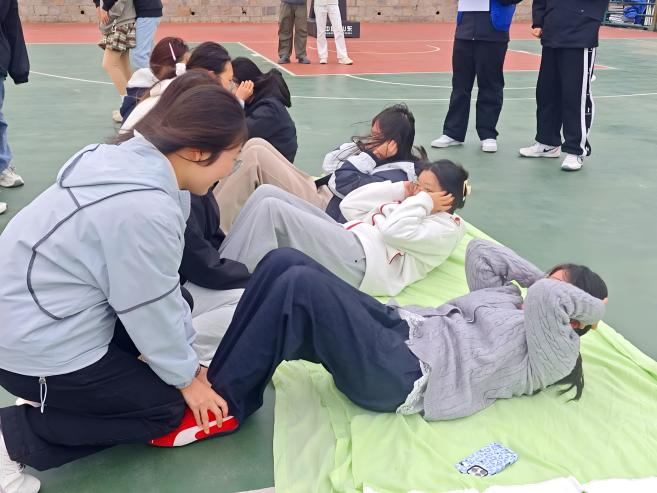 视线转向操场的另一侧,仰卧起坐的垫子上早已人声鼎沸。同学们两两一组,一人平躺发力,一人按住脚踝计数,“一、二、三……”整齐的计数声此起彼伏。腰背交替收缩舒展,汗水顺着额角滑落,滴在茵茵草坪上,晕开小小的湿痕。有人累到咬牙皱眉,却在同伴的加油声中重新挺直腰背;有人突破个人最佳成绩,兴奋地与伙伴击掌欢呼。这一个个起落的身影,是少年人永不停歇的拼搏精神。而在本次仰卧起坐中人工智能253李梓涵同学的表现尤其优异,以50个的成绩夺得冠军!