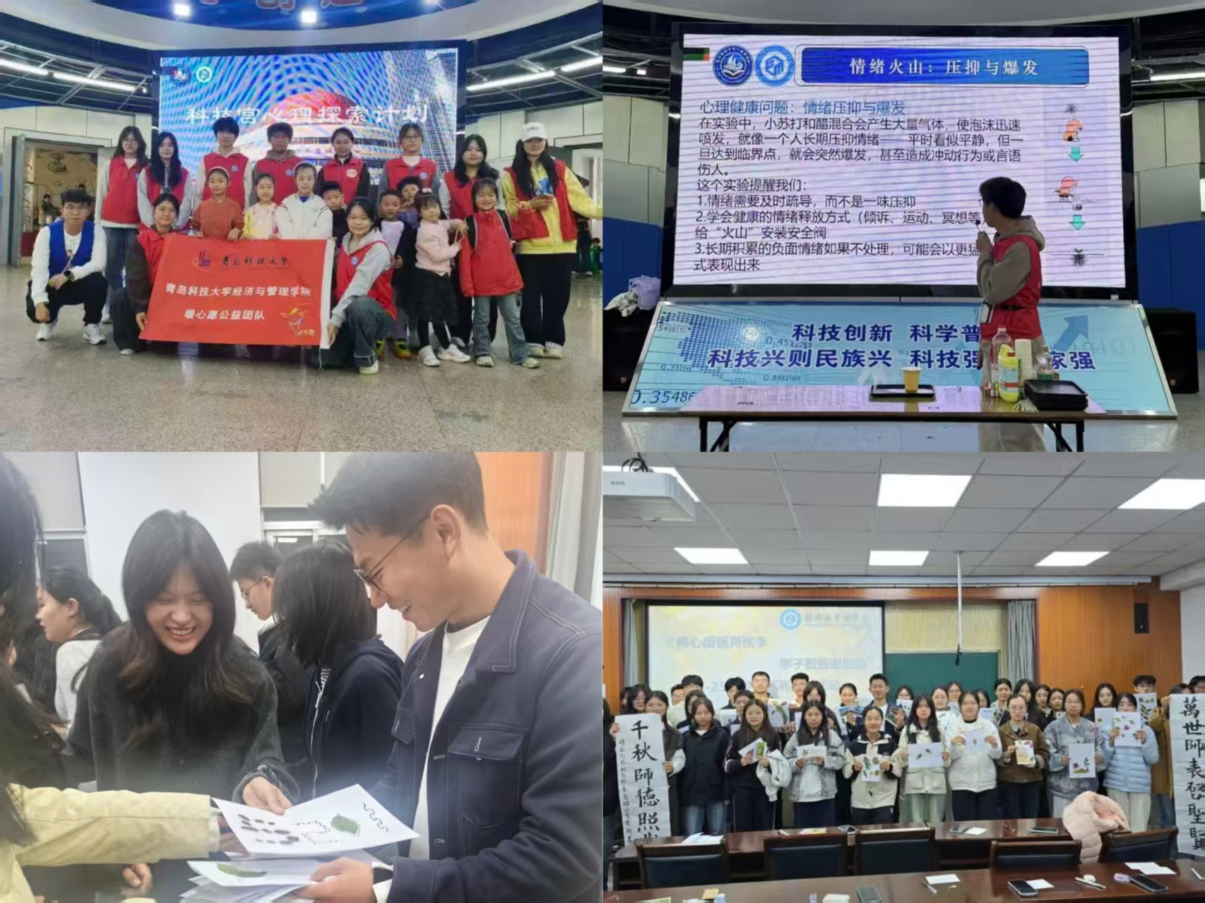 学院团委将心理健康教育工作常态化融入学生工作中,以“心海”育人品牌为依托,不断贴近学生“个性化”需求,把握学生“兴趣点”,在教育“吸引力”上下功夫。开展“师心暖暖育桃李,学子殷殷谢恩情”10·25心理健康教育系列活动,组织学生以书信、书叶作品向老师表达感恩之心与敬重之情,拉近师生距离,为构建和谐健康、互敬互爱的师生关系注入温暖力量。同时围绕学生社会责任培育需求,拓展“心理+实践”赋能模式,开展校外“第三课堂”。组织暖心愿公益团队多次走进青岛市科技宫,开展“童心探索科学奥秘,温暖心灵健康成长”心理健康科普志愿实践活动,以“心理知识传递+实践赋能体验”为双重目标,创新实践形式,将心理健康活动融入科普志愿服务当中,助力儿童认识情绪、调节自我,为社会新生力量的健康发展注入新的活力。